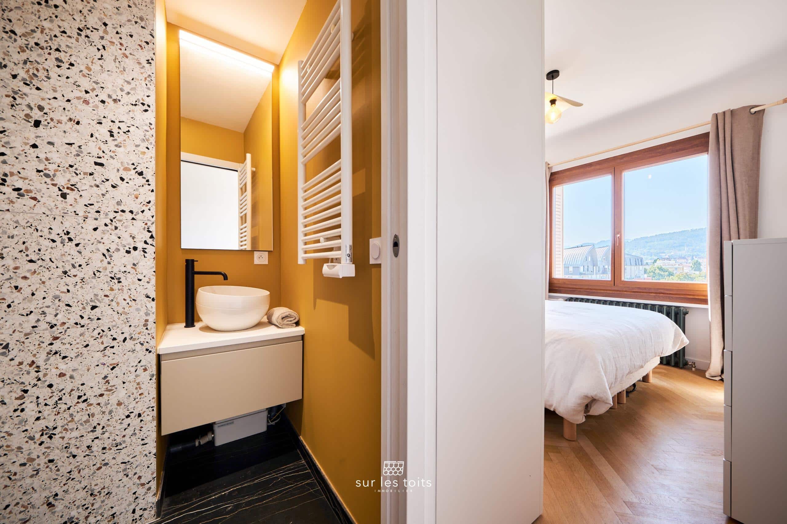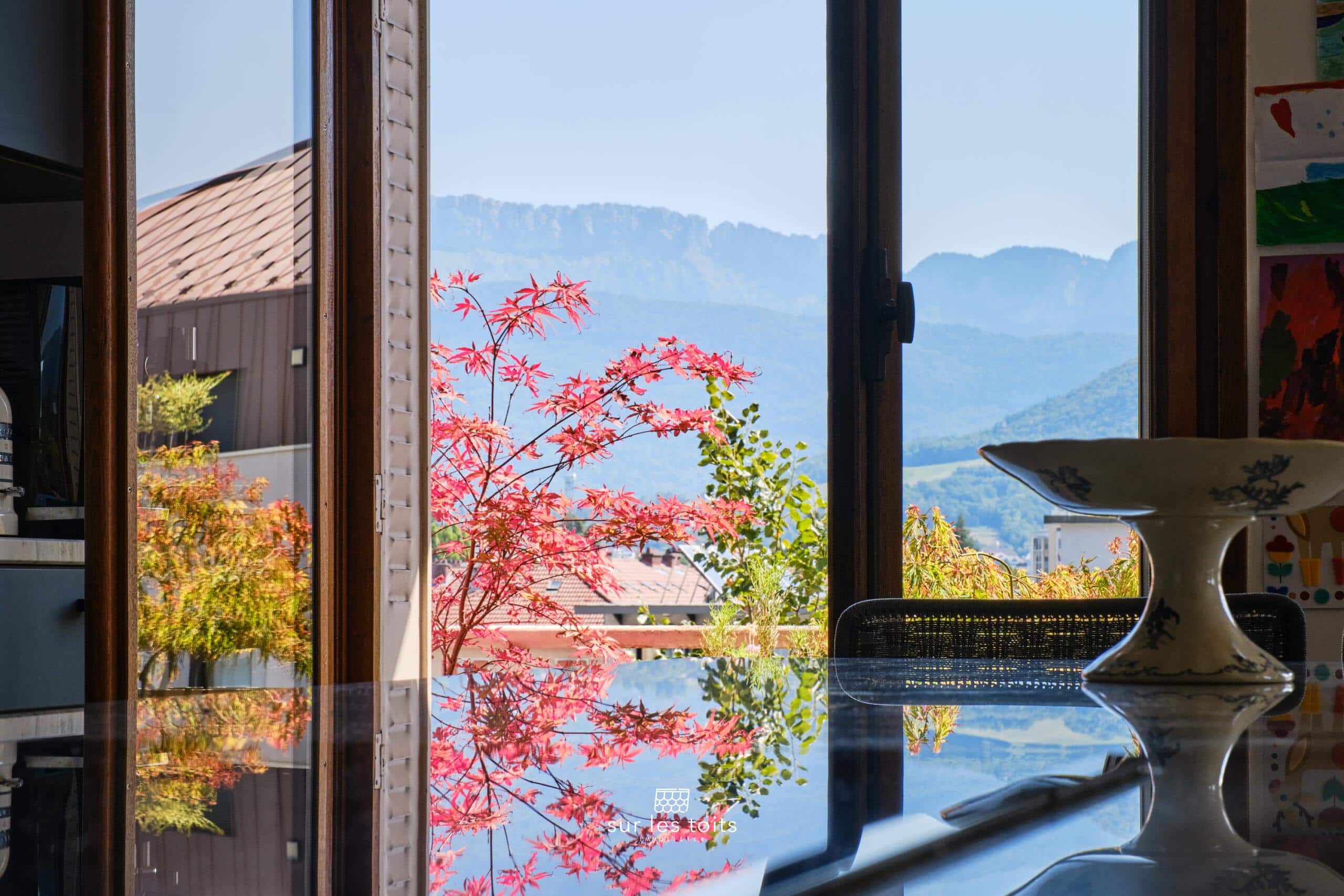 La pièce principale, spacieuse et baignée de lumière, offre un cadre de vie remarquable avec une vue imprenable sur les montagnes et le château depuis le salon. La cuisine Schmidt entièrement équipée, ouverte sur cet espace, s’intègre parfaitement à l’ensemble et donne accès à deux balcons exposés sud-est, idéals pour profiter pleinement de la vue.