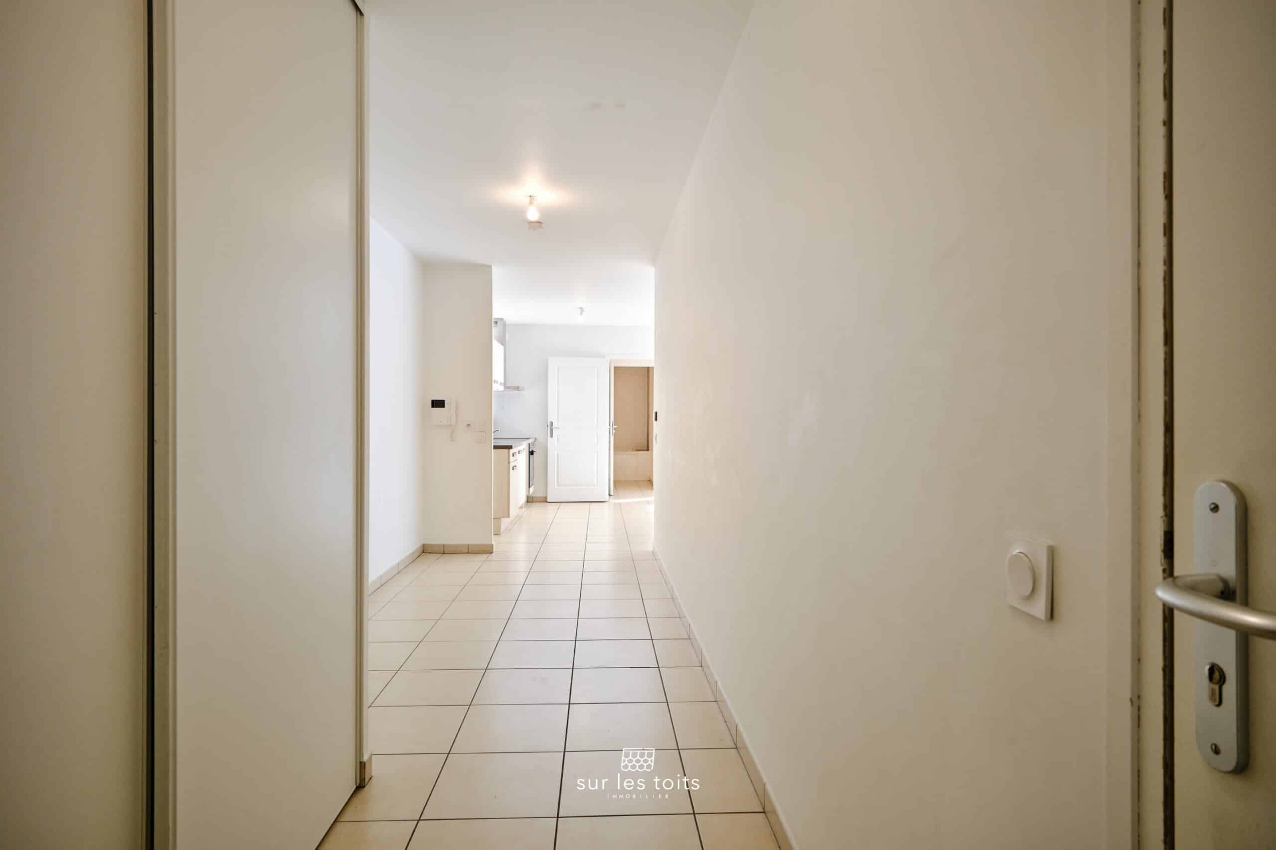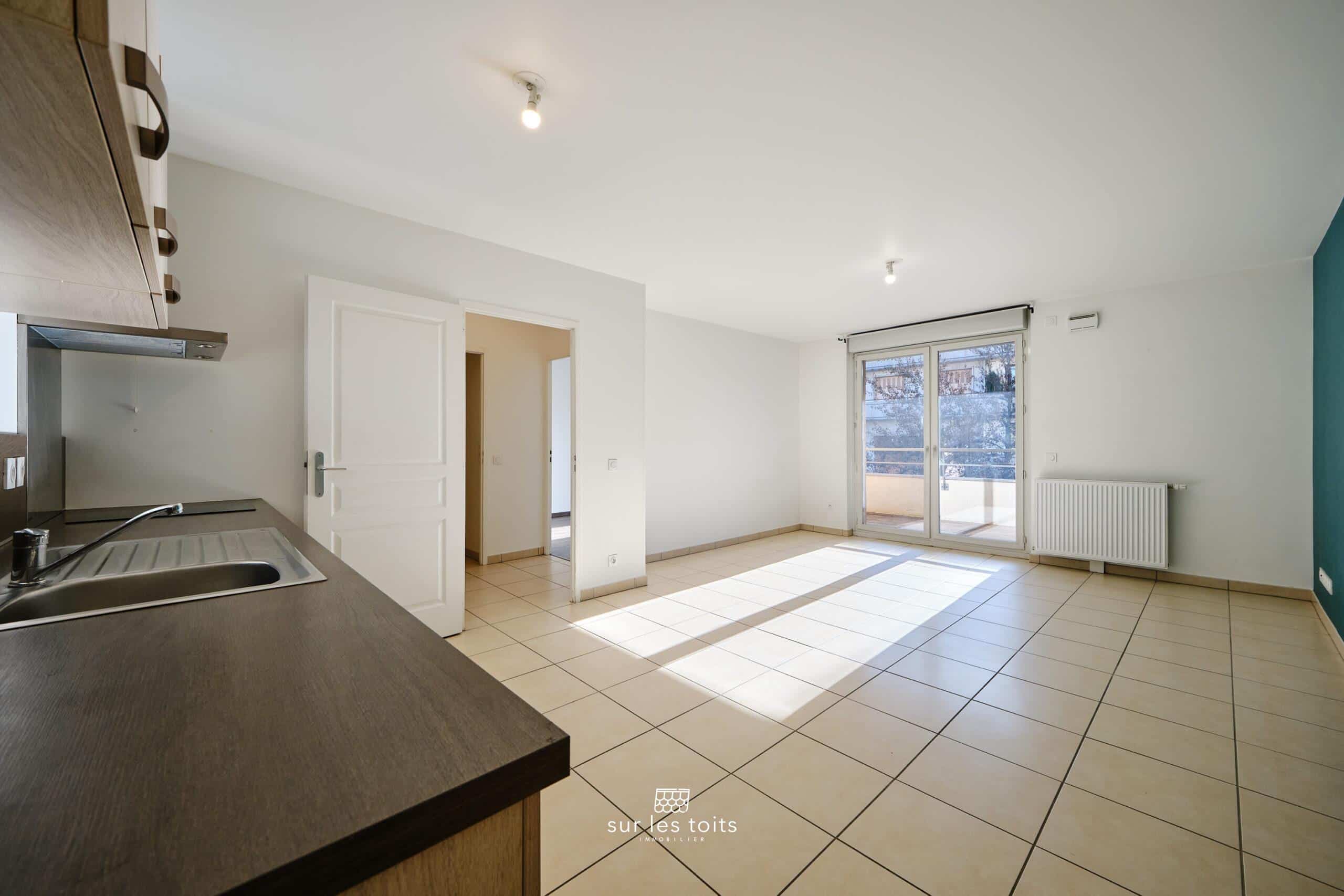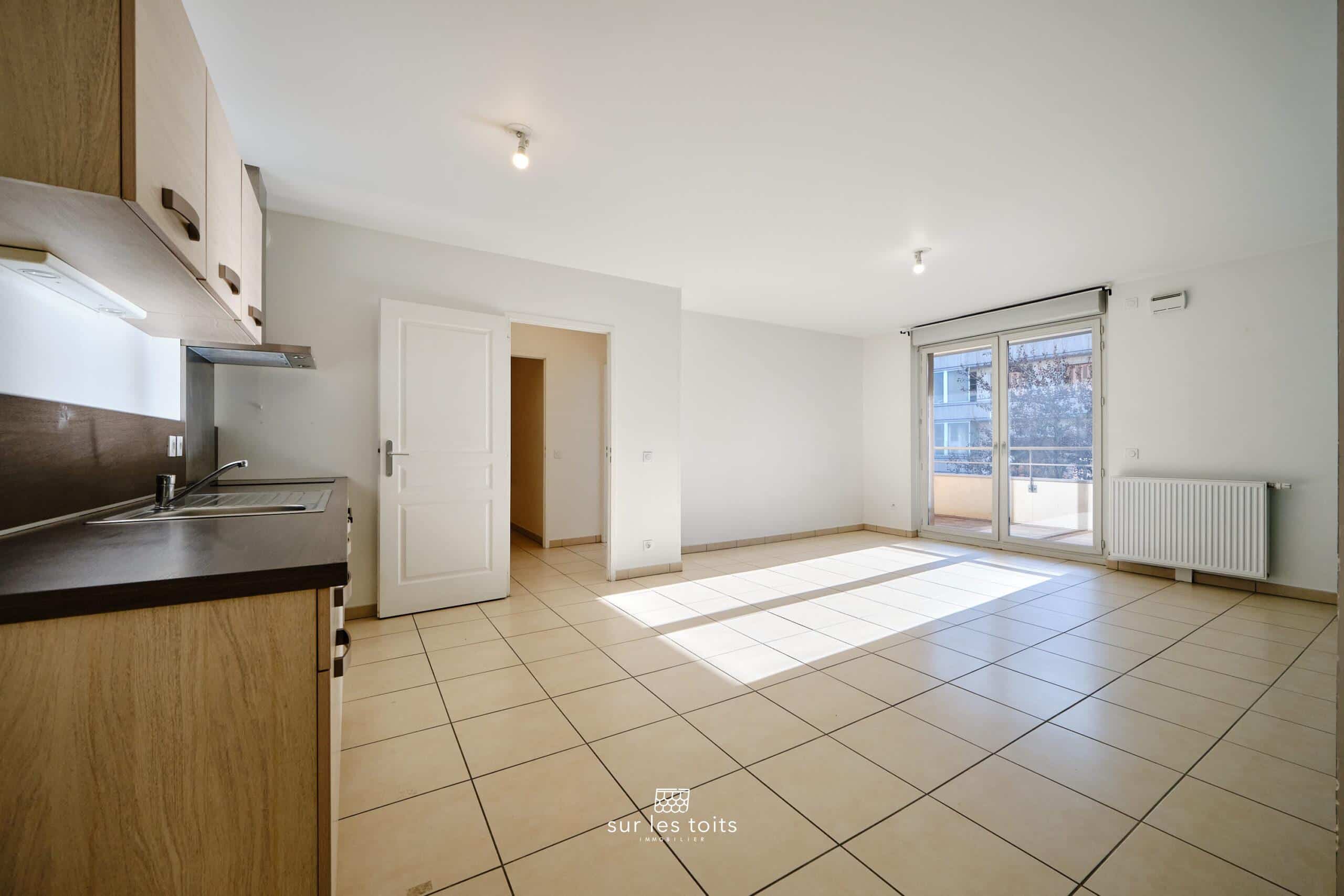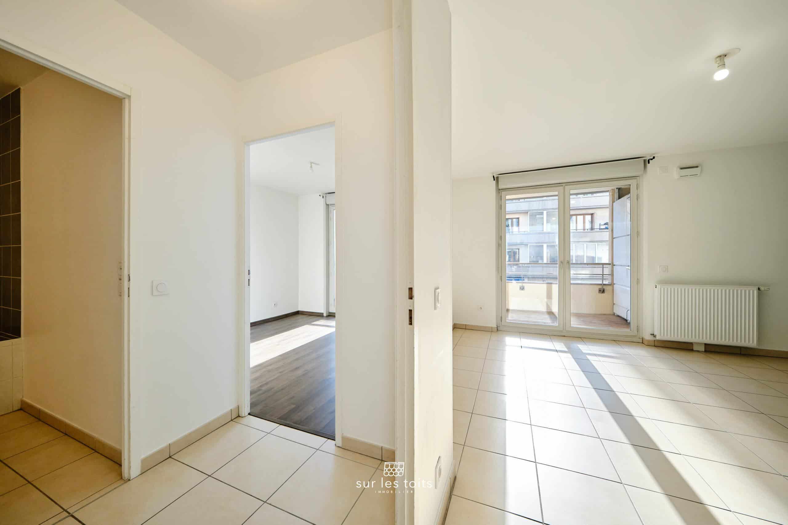 L’entrée, spacieuse et fonctionnelle, dispose d’un placard intégré ainsi que d’un couloir pouvant accueillir un espace bureau ou un couchage d’appoint. Elle mène à une grande pièce de vie lumineuse, ouverte sur une terrasse d’environ 10 m², un véritable atout en centre-ville. La cuisine Mobalpa équipée est ouverte sur le séjour et bénéficie d’une exposition plein Sud.