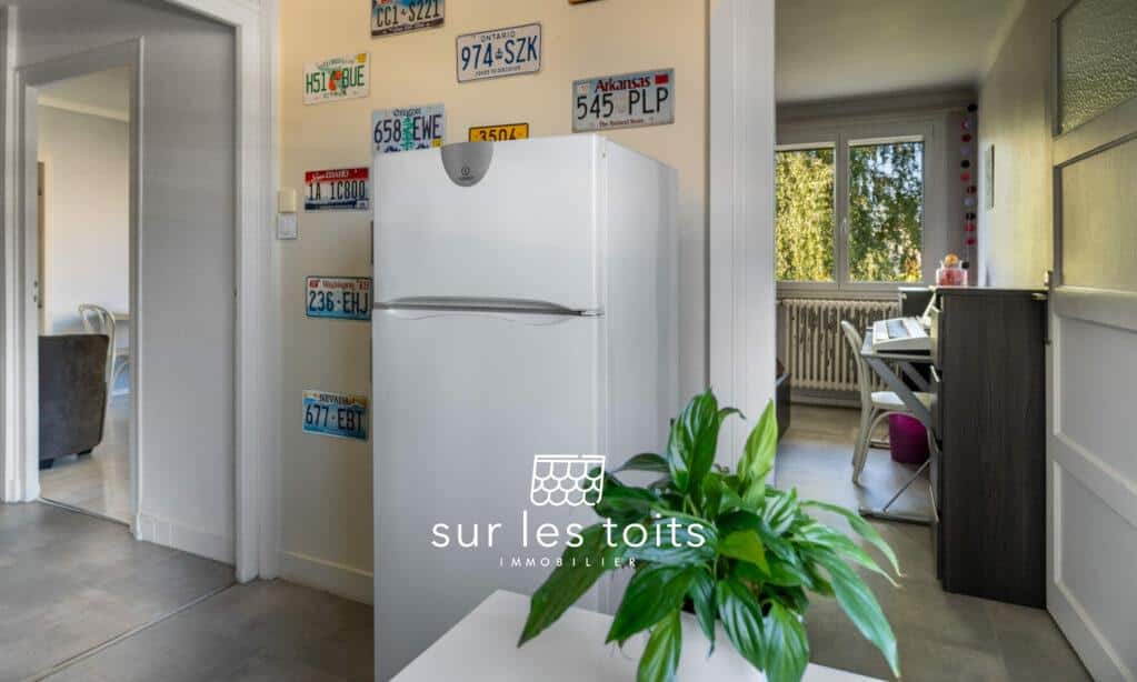 Le hall d’entrée, avec placards et cellier, dessert un séjour lumineux avec accès à un grand balcon exposé Ouest, une salle d’eau avec WC et une cuisine équipée indépendante.