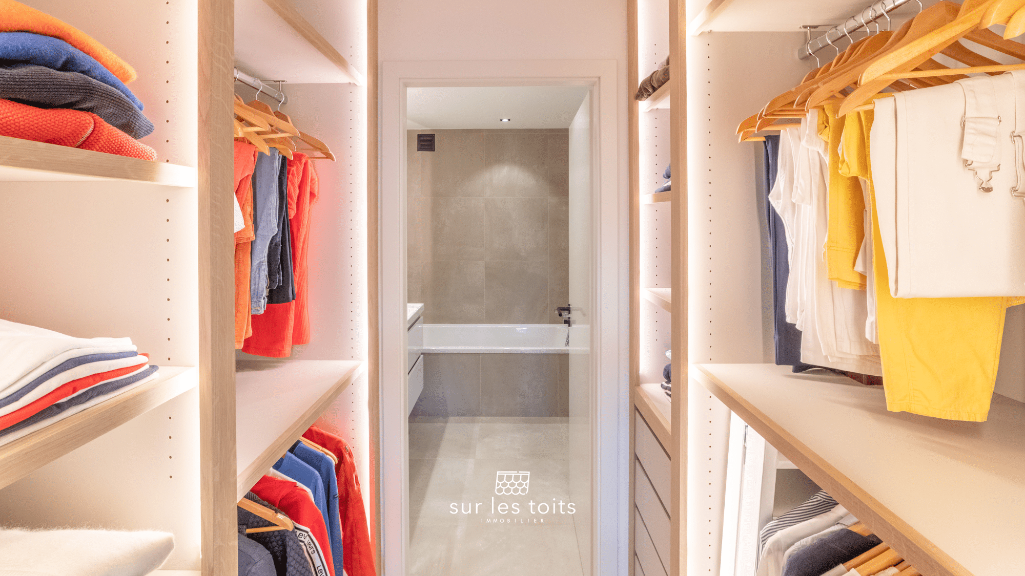 L’entrée dessert d’un côté, le séjour de 21m² avec l’accès au balcon orienté Sud-Ouest et sa vue imprenable sur les montagnes et de l’autre la cuisine haut de gamme. Deux belles chambres de respectivement 12,33 et 13m², un dressing, une salle de bain avec douche et baignoire, complètent l’ensemble.