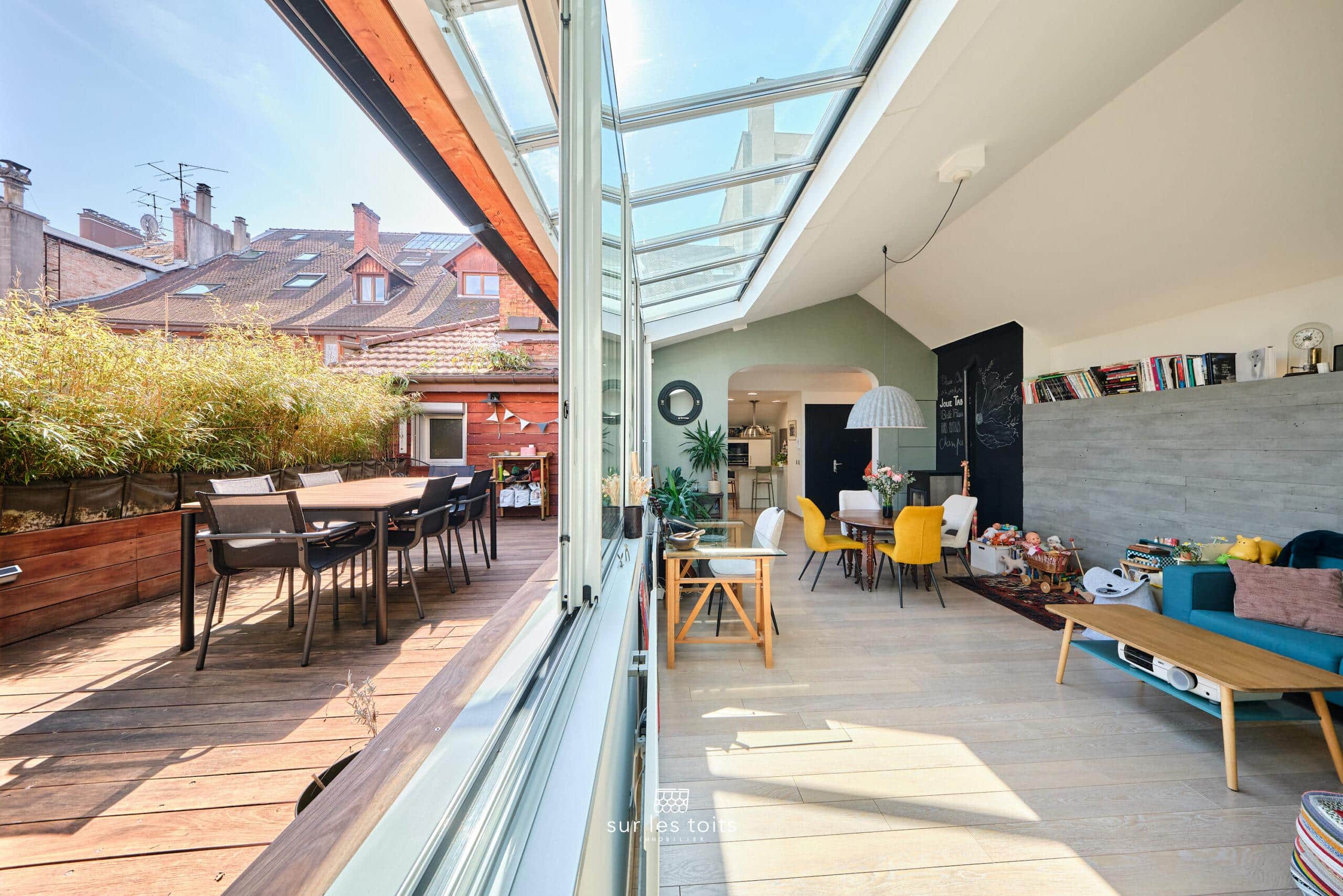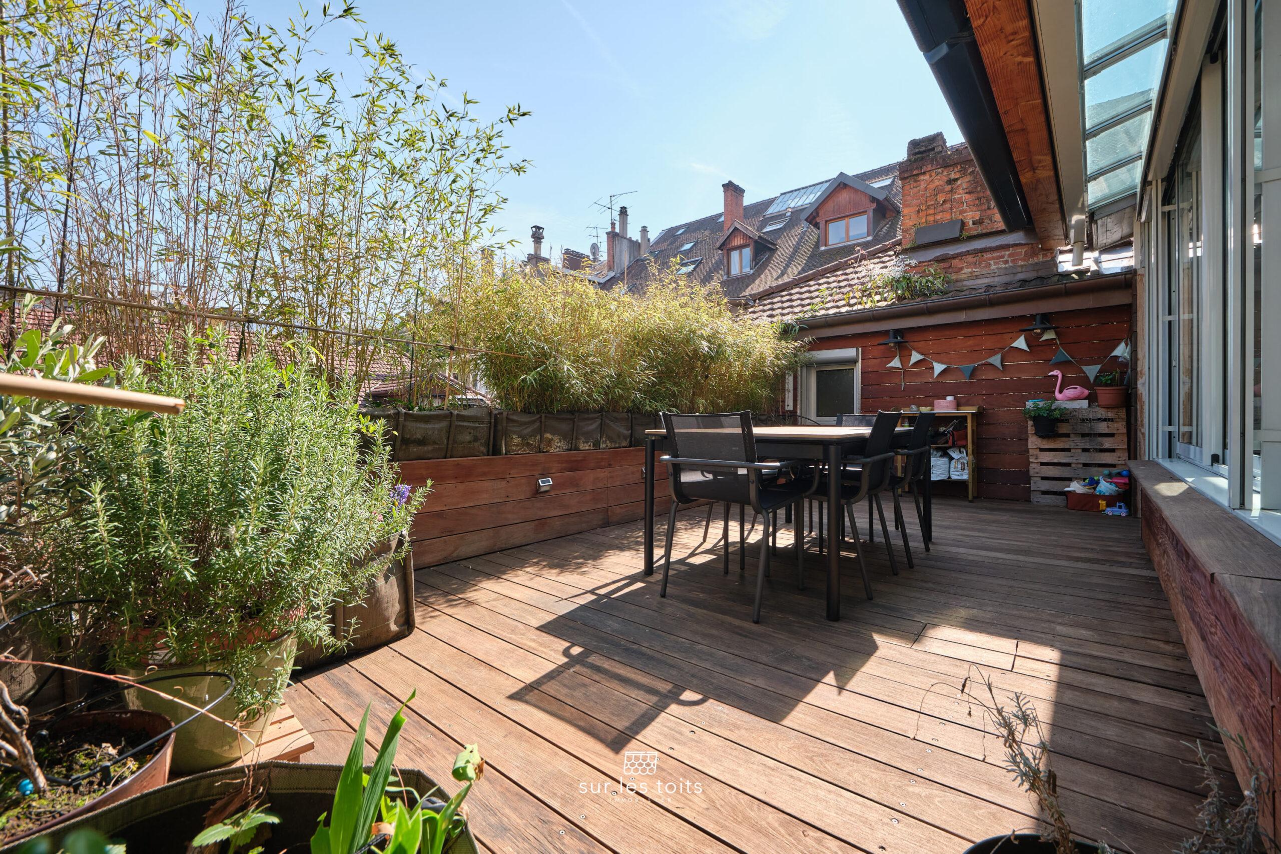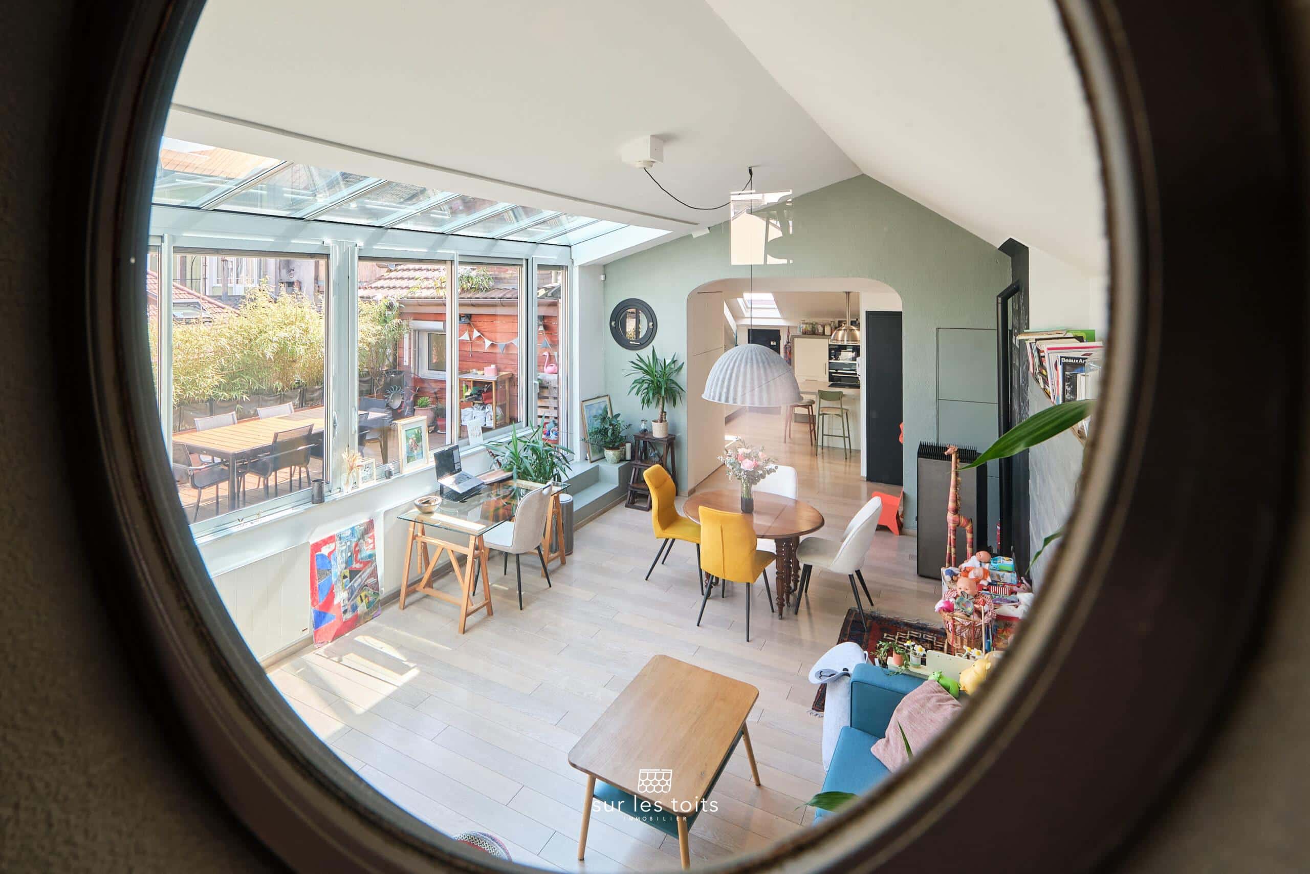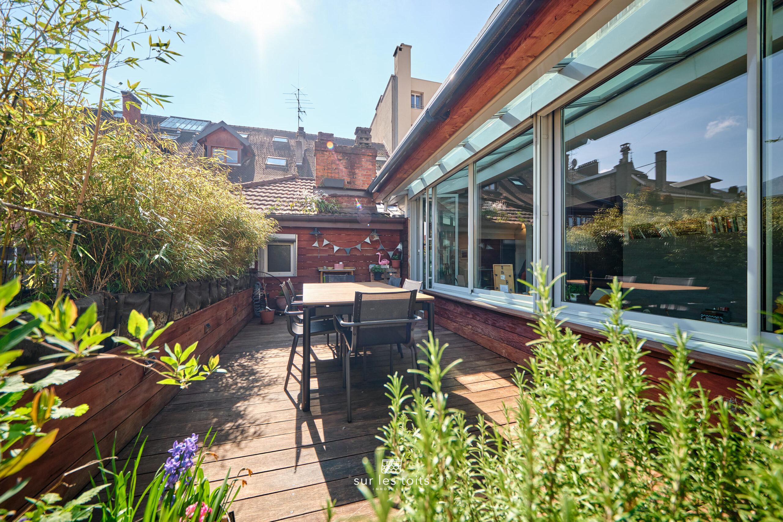 Insoupçonnable depuis la rue, ce bien rare à la vente de 117 m² habitables (94 m² loi Carrez) séduit immédiatement par ses volumes, son cachet et sa superbe terrasse à l’abri des regards.
