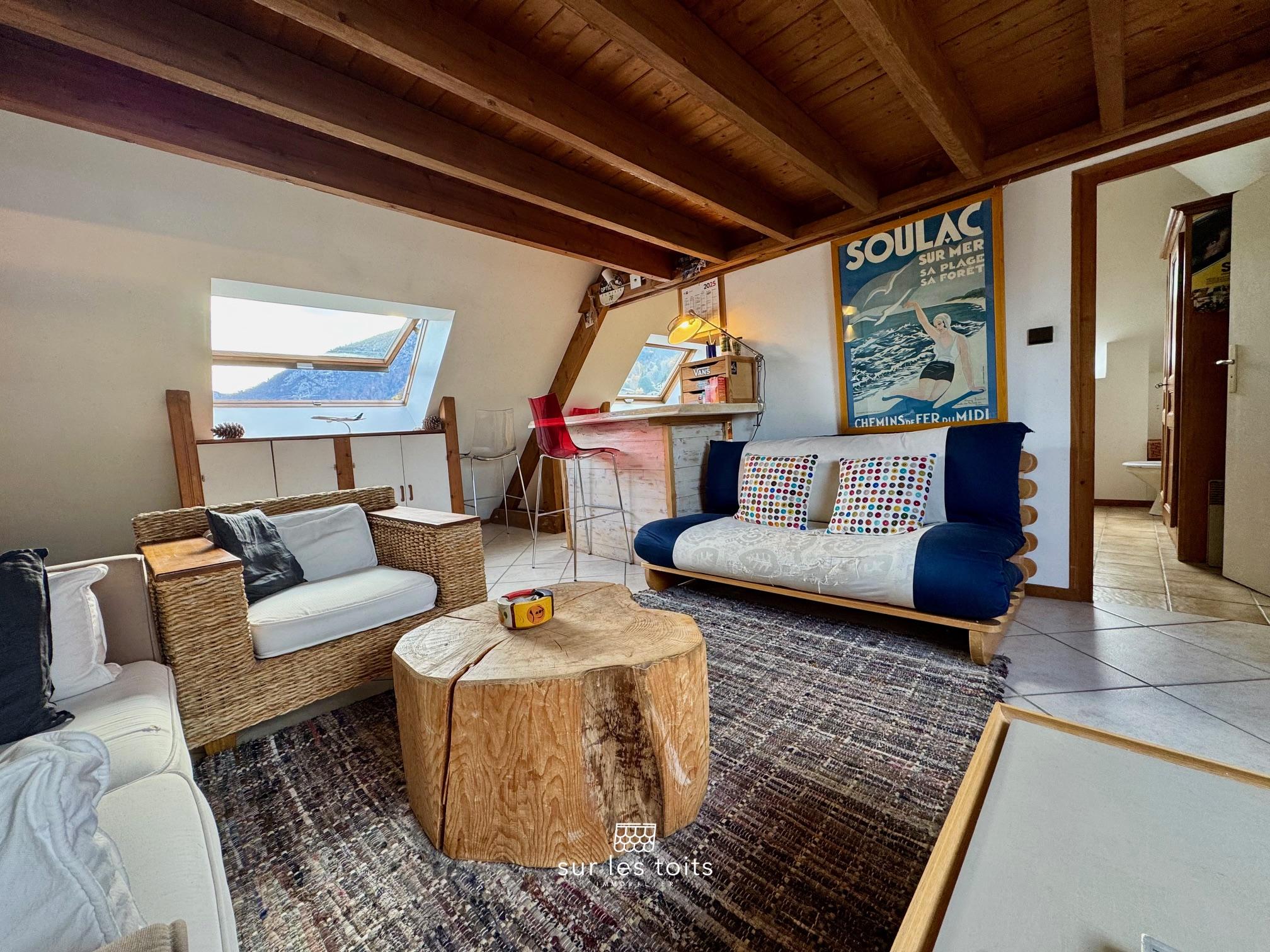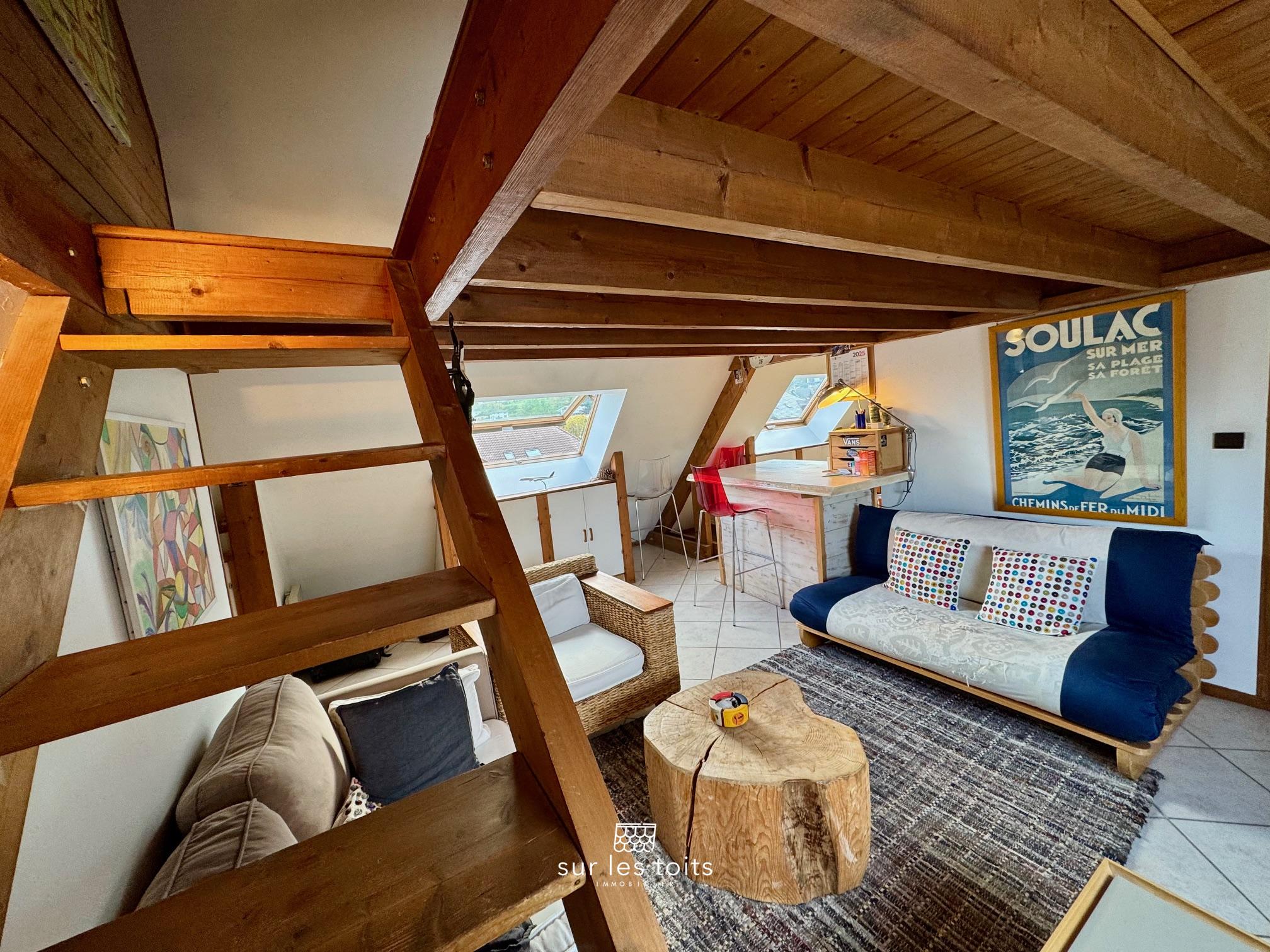 La pièce principale accueille le séjour avec une cuisine semi-ouverte, créant un espace simple et fonctionnel. Une salle de bain complète ce niveau. La chambre, en mezzanine, renforce le charme du duplex et l’intimité de l’appartement. L’ensemble dégage une atmosphère chaleureuse et cocooning, conçu comme un véritable refuge tranquille.