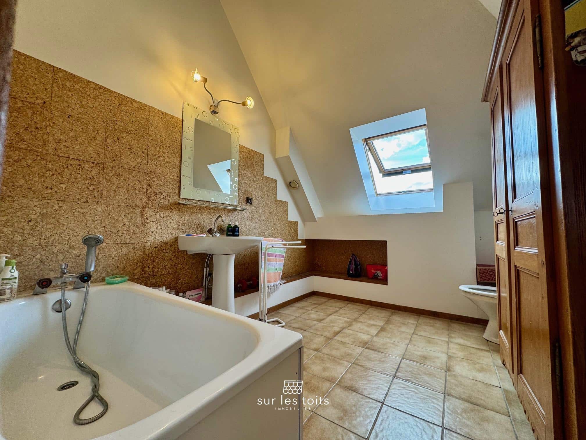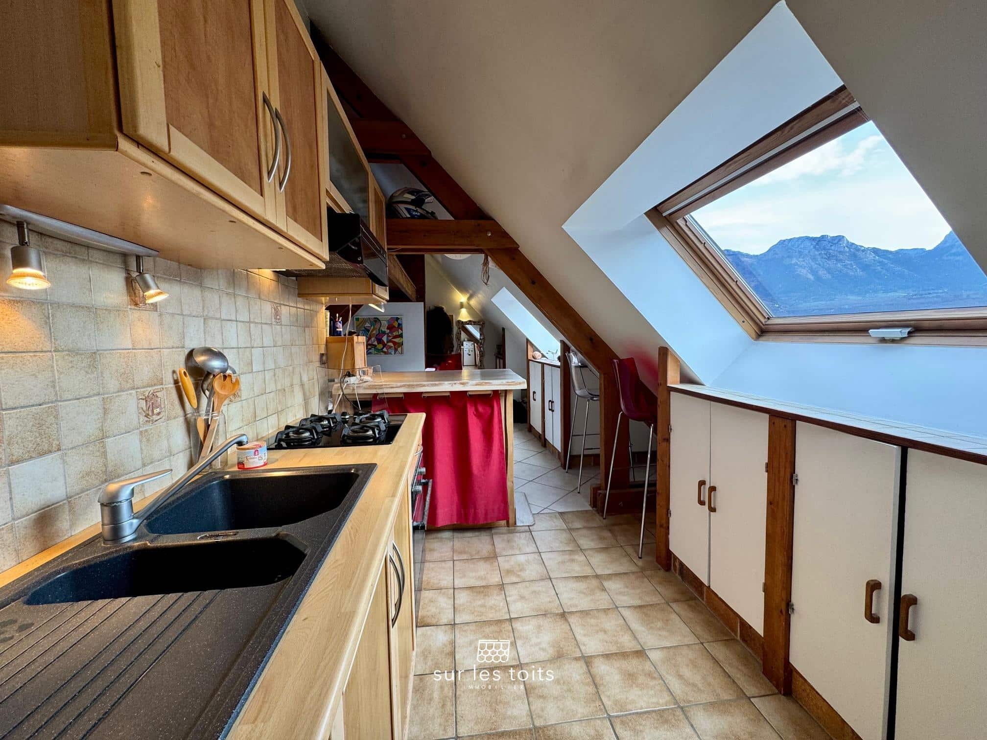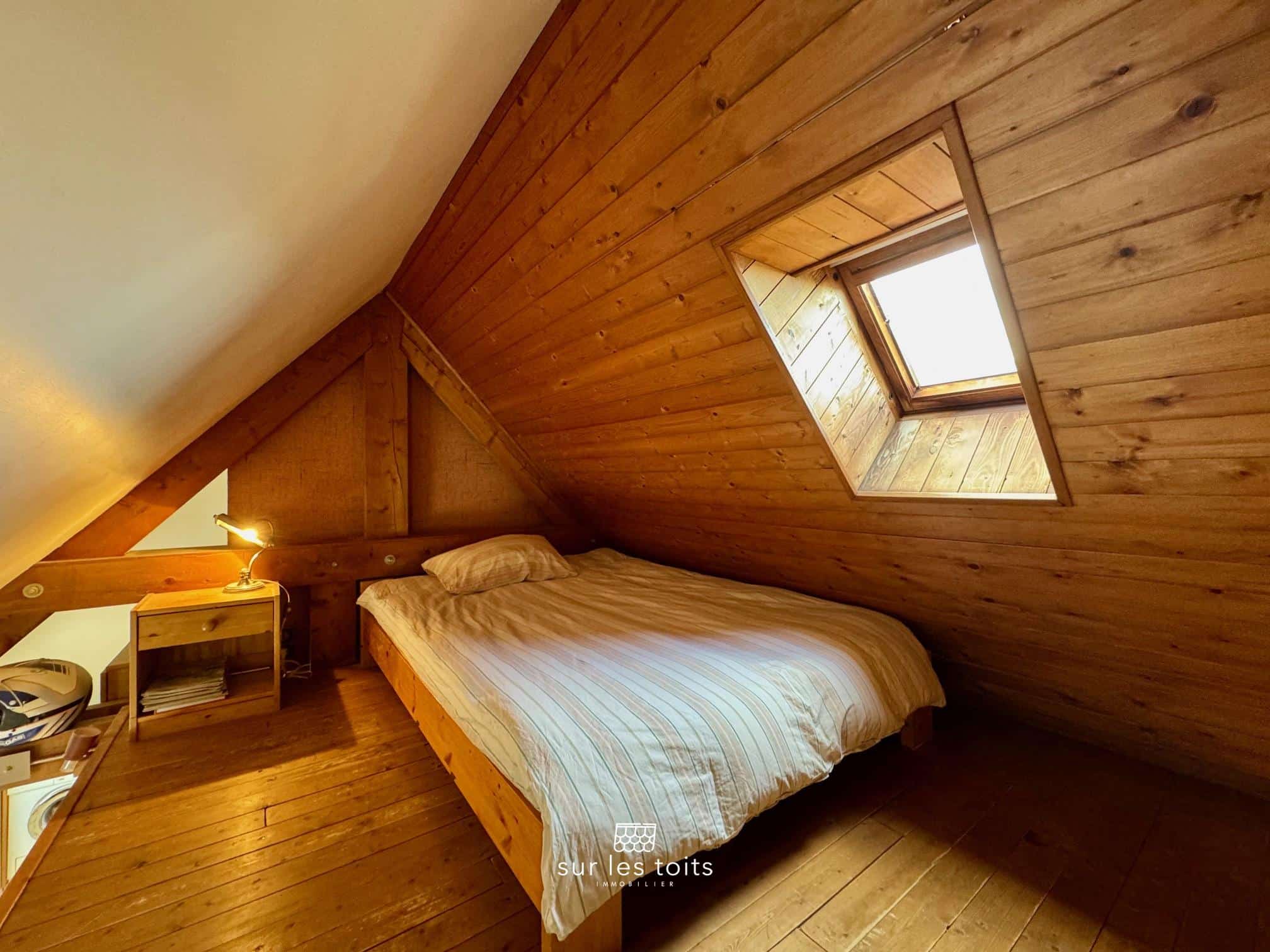 Il dispose de 28 m² loi carrez pour 62 m² au sol, où les volumes sous les toits offrent une impression d’espace généreuse et un confort de vie agréable au quotidien.