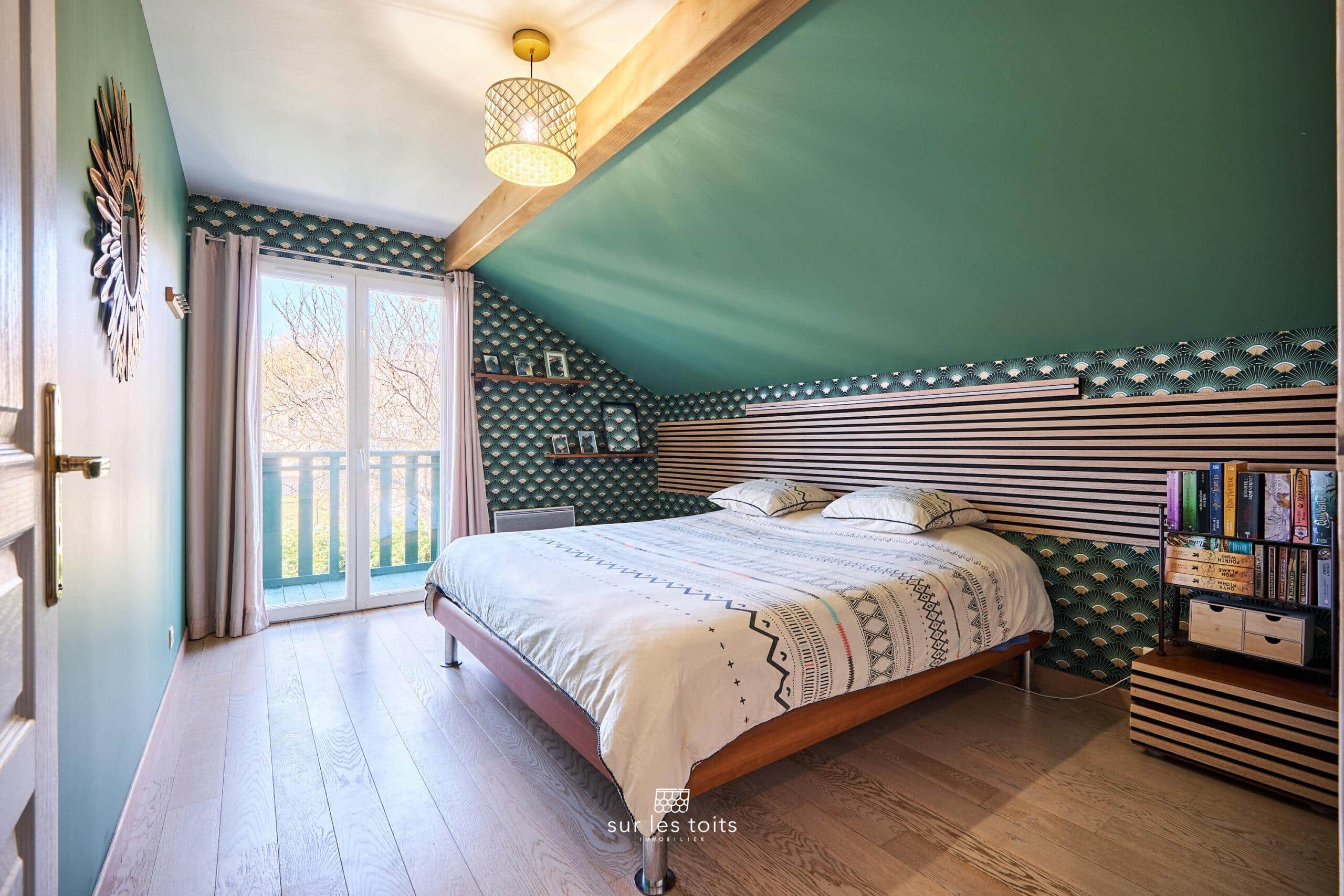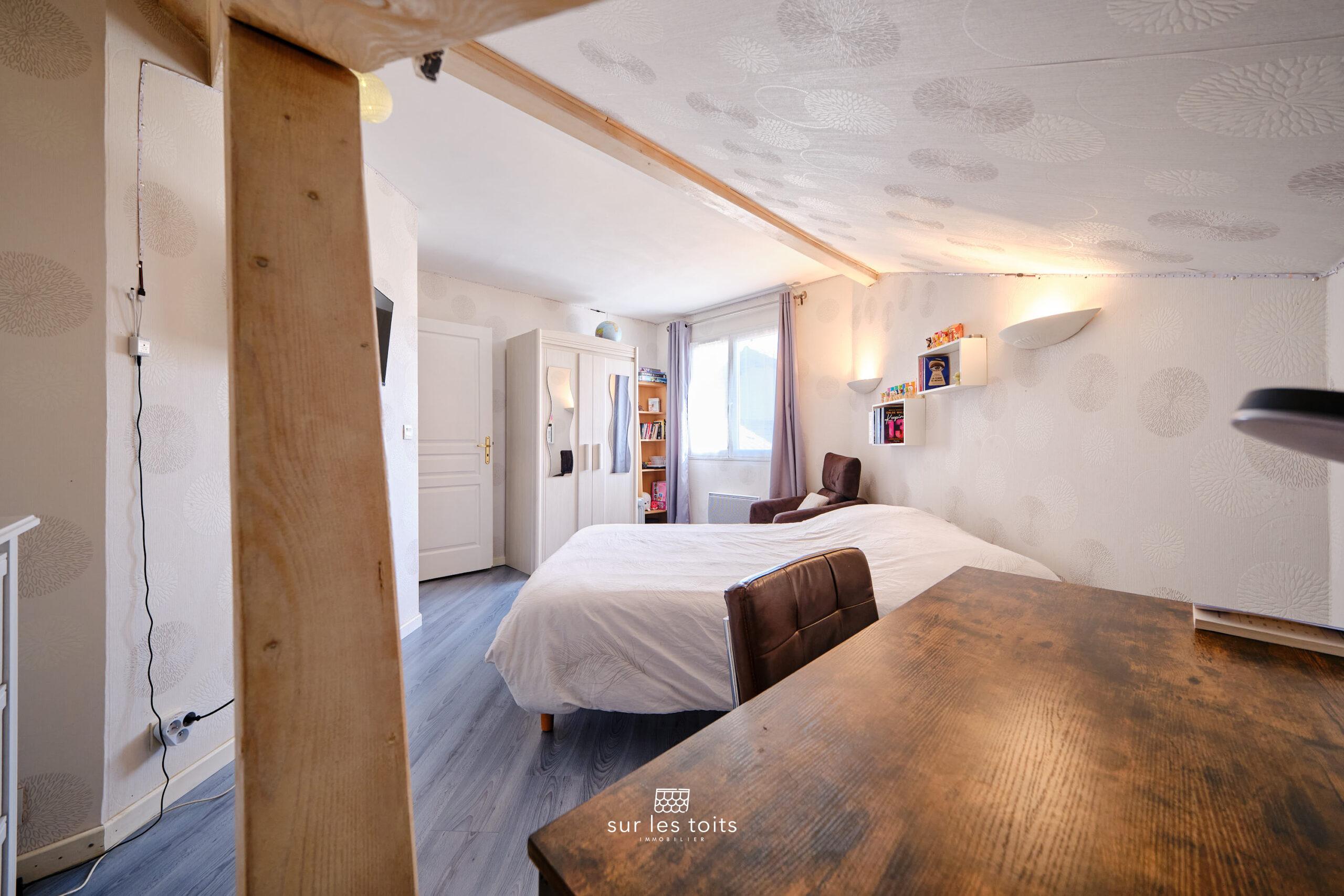 Un escalier en bois vous conduira à l’étage où vous trouverez deux chambres, dont une avec balcon, et un bureau pouvant faire office de chambre d’enfant ou d’espace de détente.