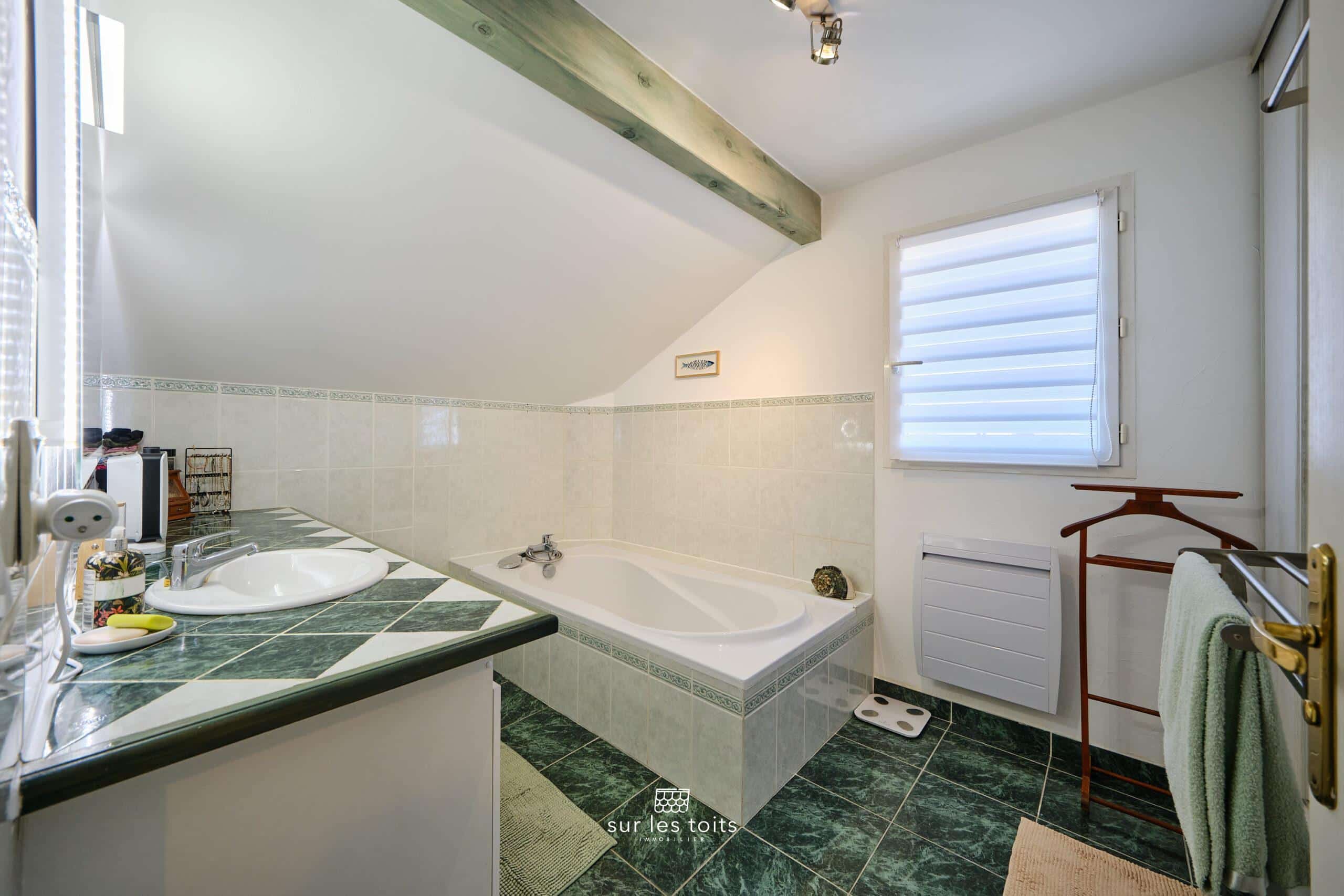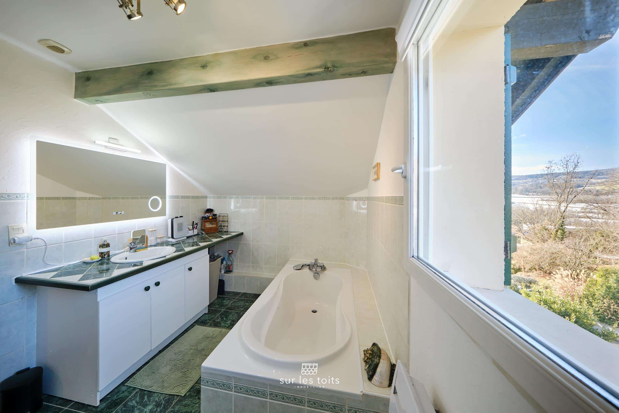 La grande salle de bain de 7m2 bénéficie d’une ventilation naturelle grâce à une fenêtre donnant sur le jardin.