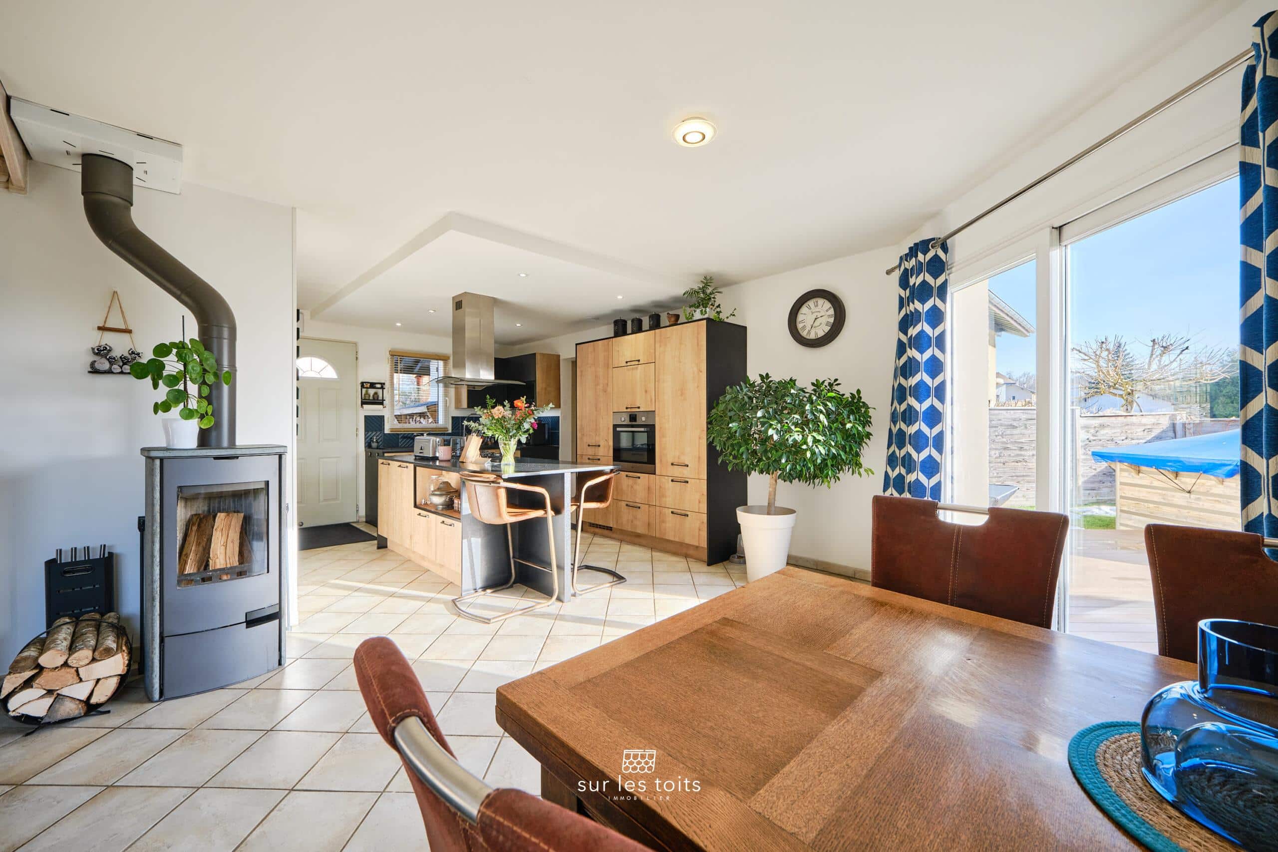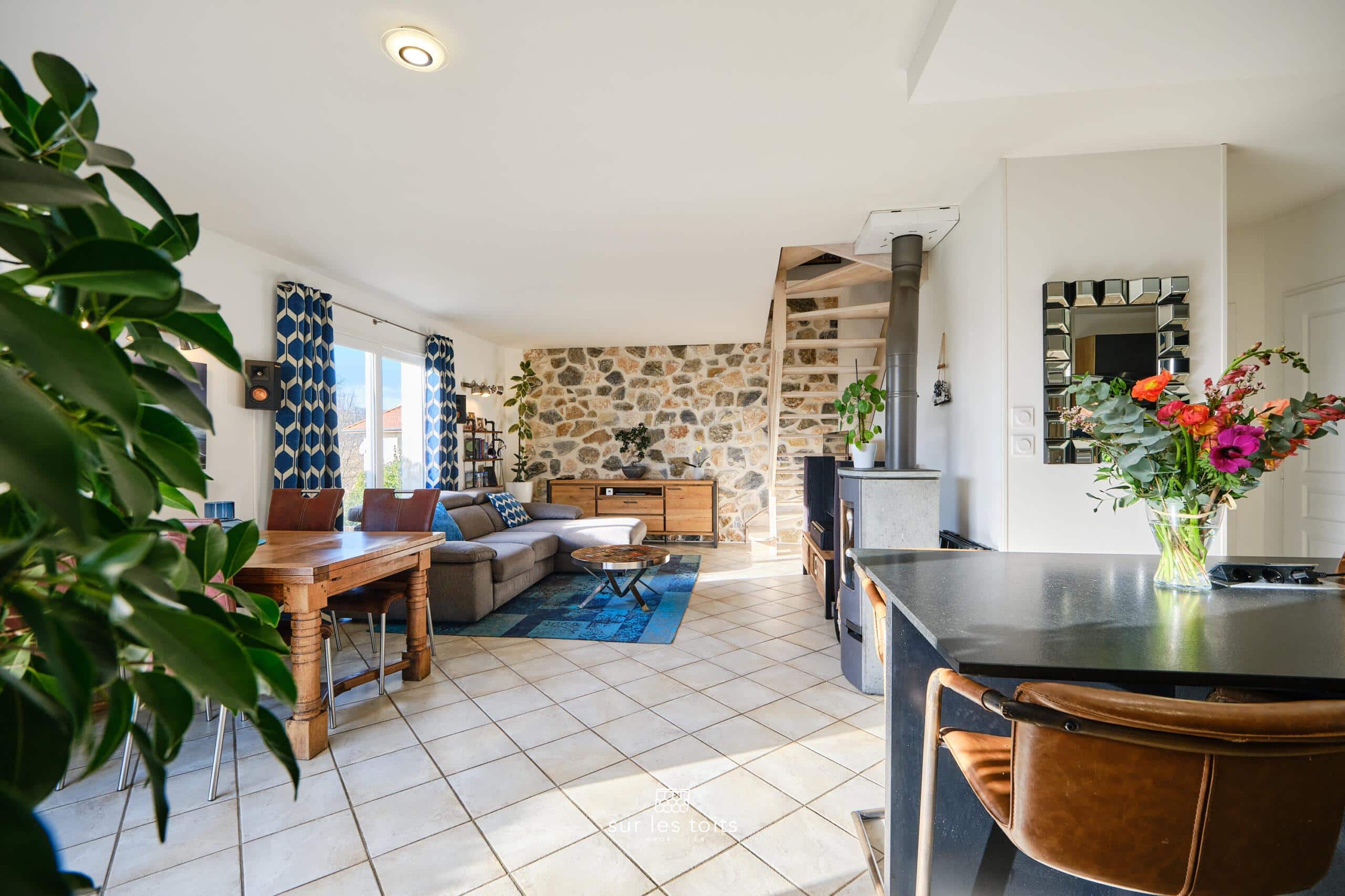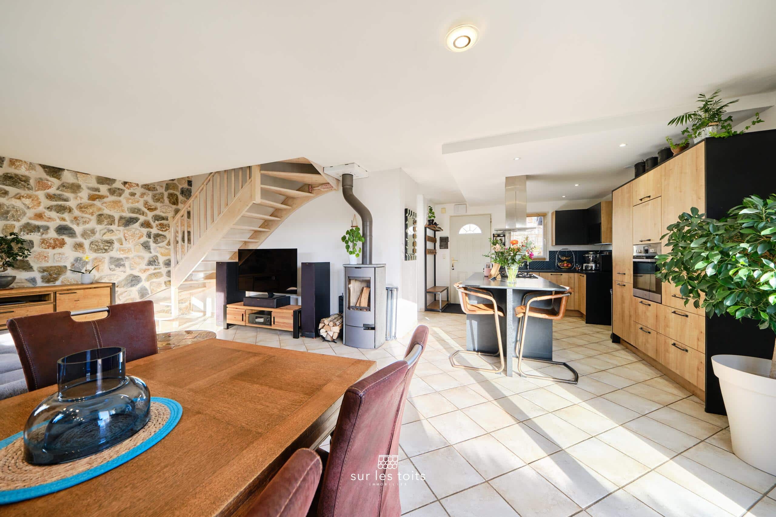 Au rez-de-chaussée, vous trouverez un séjour chaleureux de 30m2 avec poêle à bois. Un mur en pierre apporte une touche d’authenticité à l’ensemble.