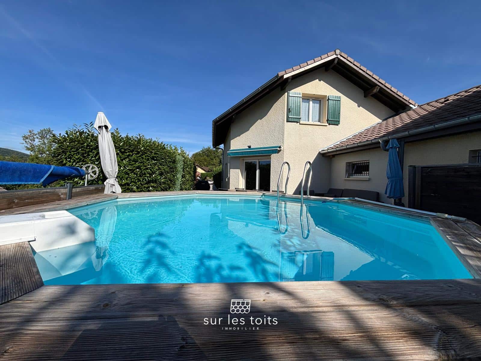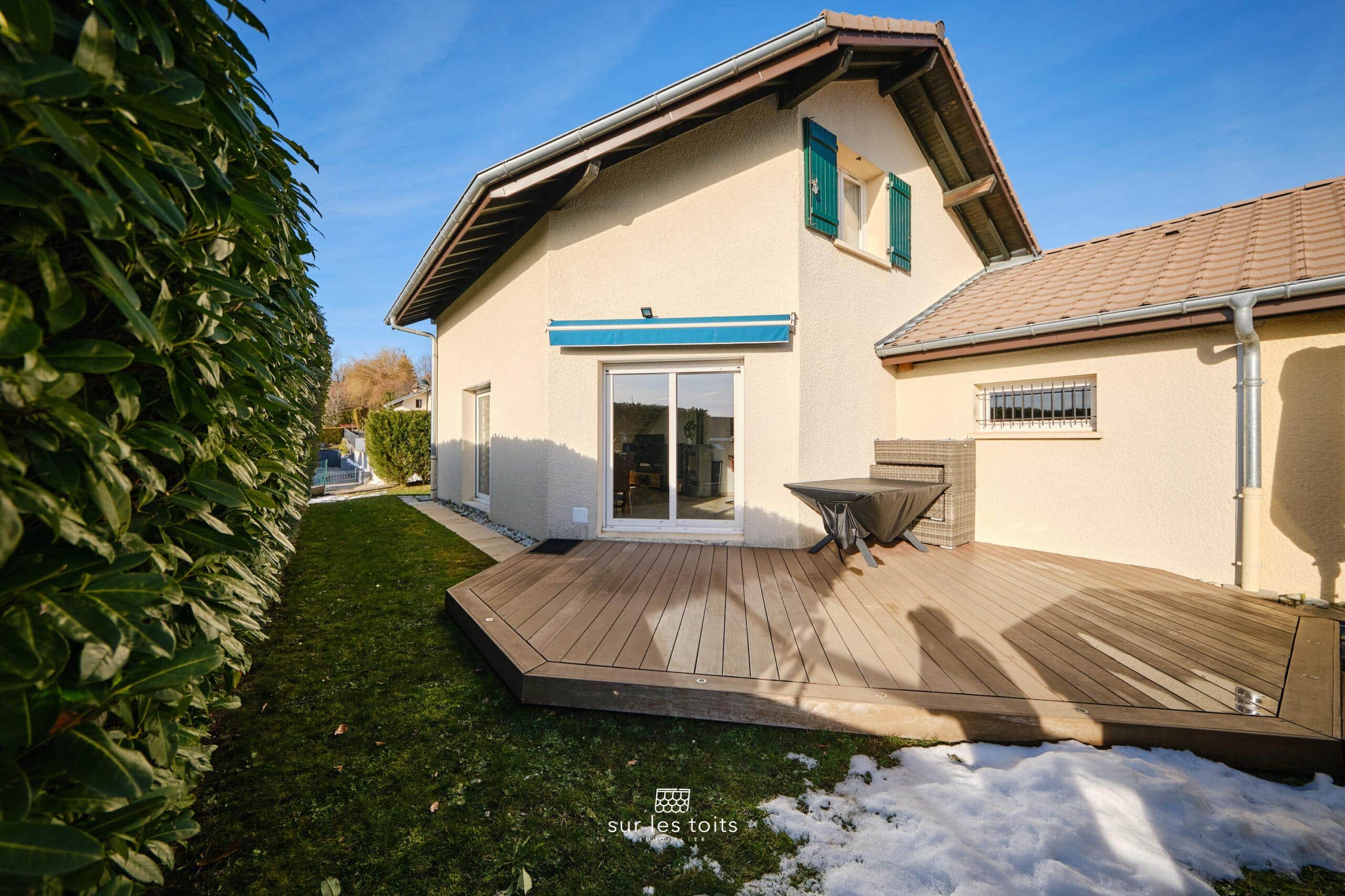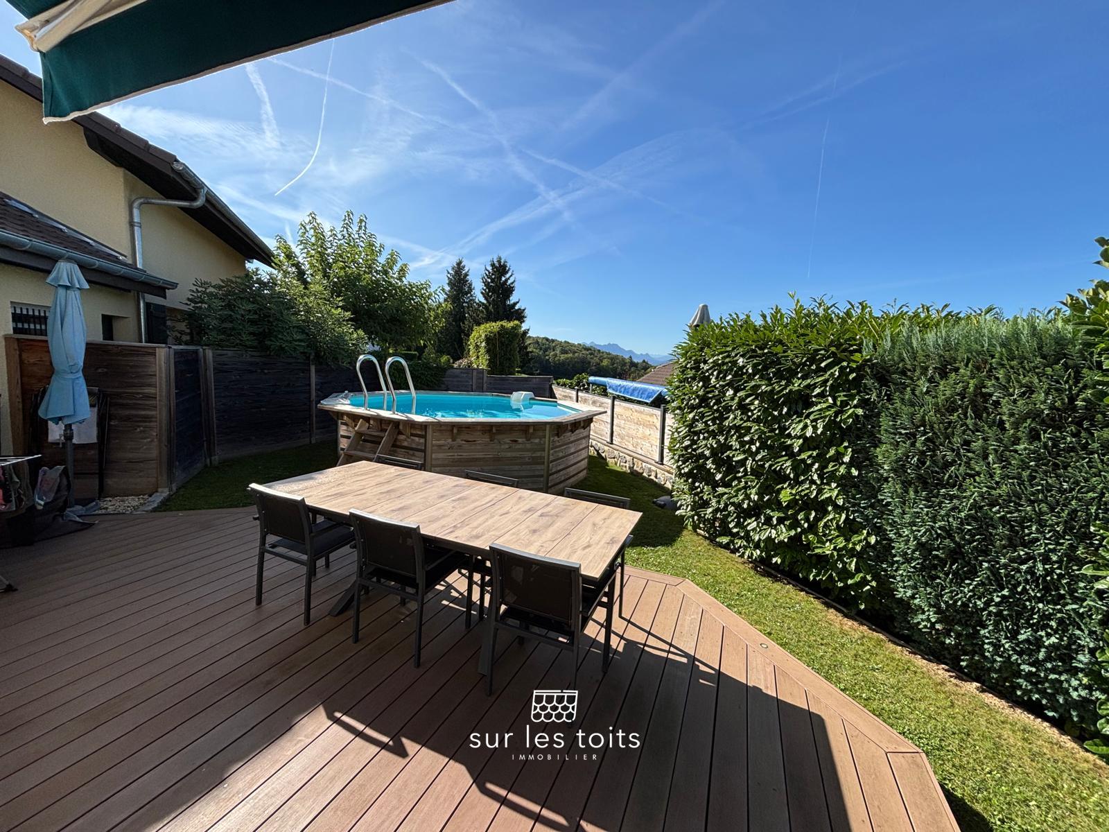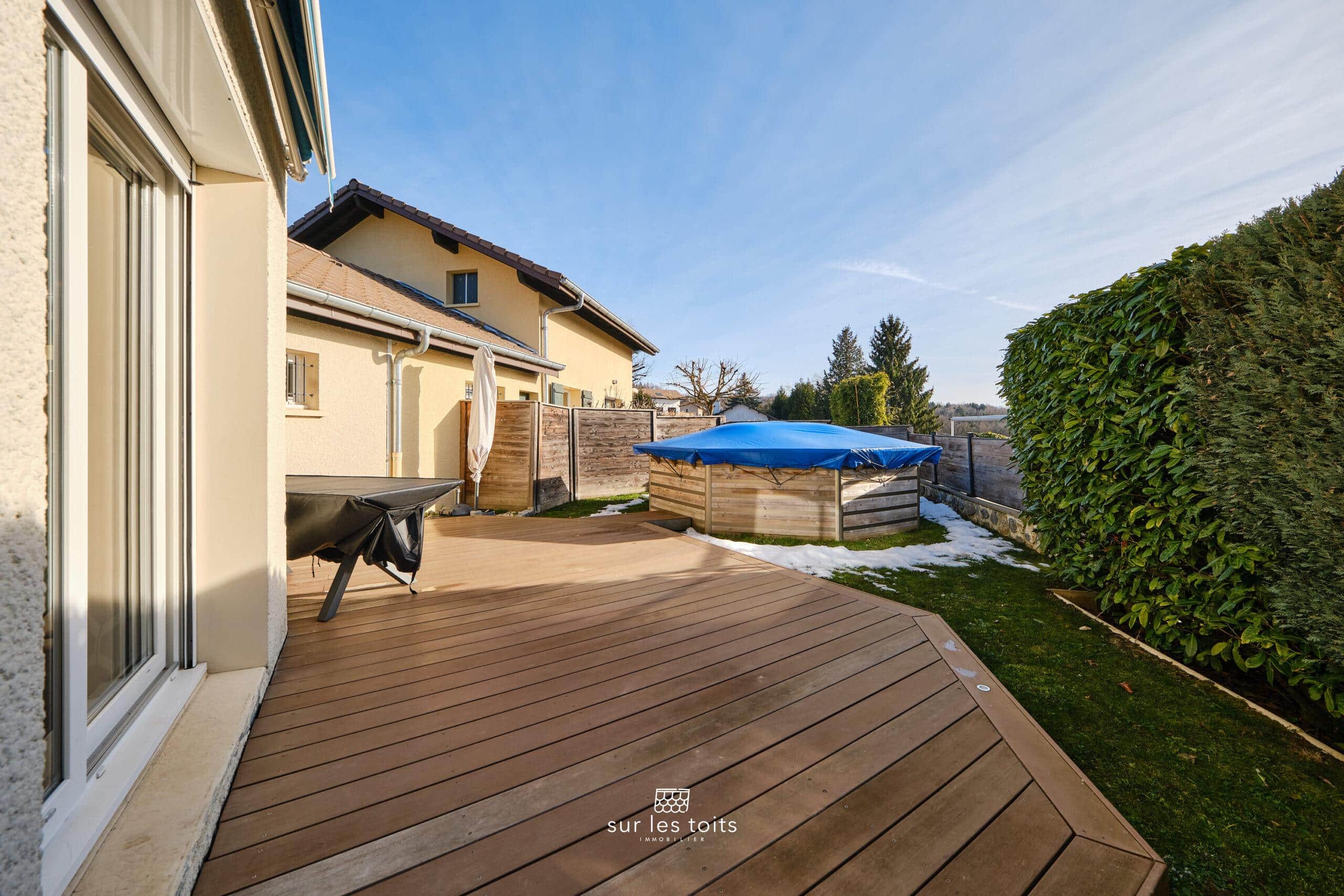 L’espace de vie donne accès à une terrasse en bois exotique (Ipé) de 18m2 environ, avec store banne, qui se prolonge par une piscine hors sol, idéale pour les journées ensoleillées.