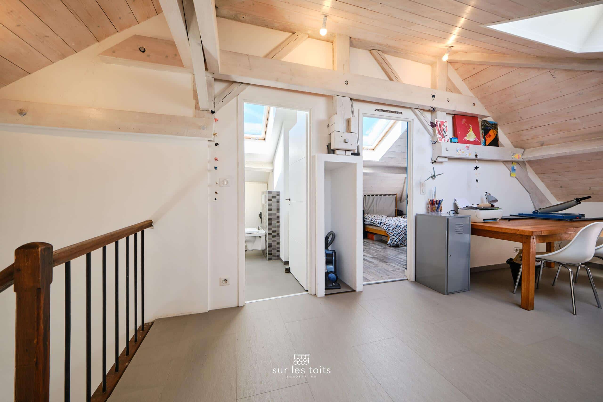 À l’étage supérieur, une salle de jeux sur laquelle se distribuent deux chambres ainsi qu’une salle de bains, offrant un espace nuit parfaitement adapté à une vie de famille.