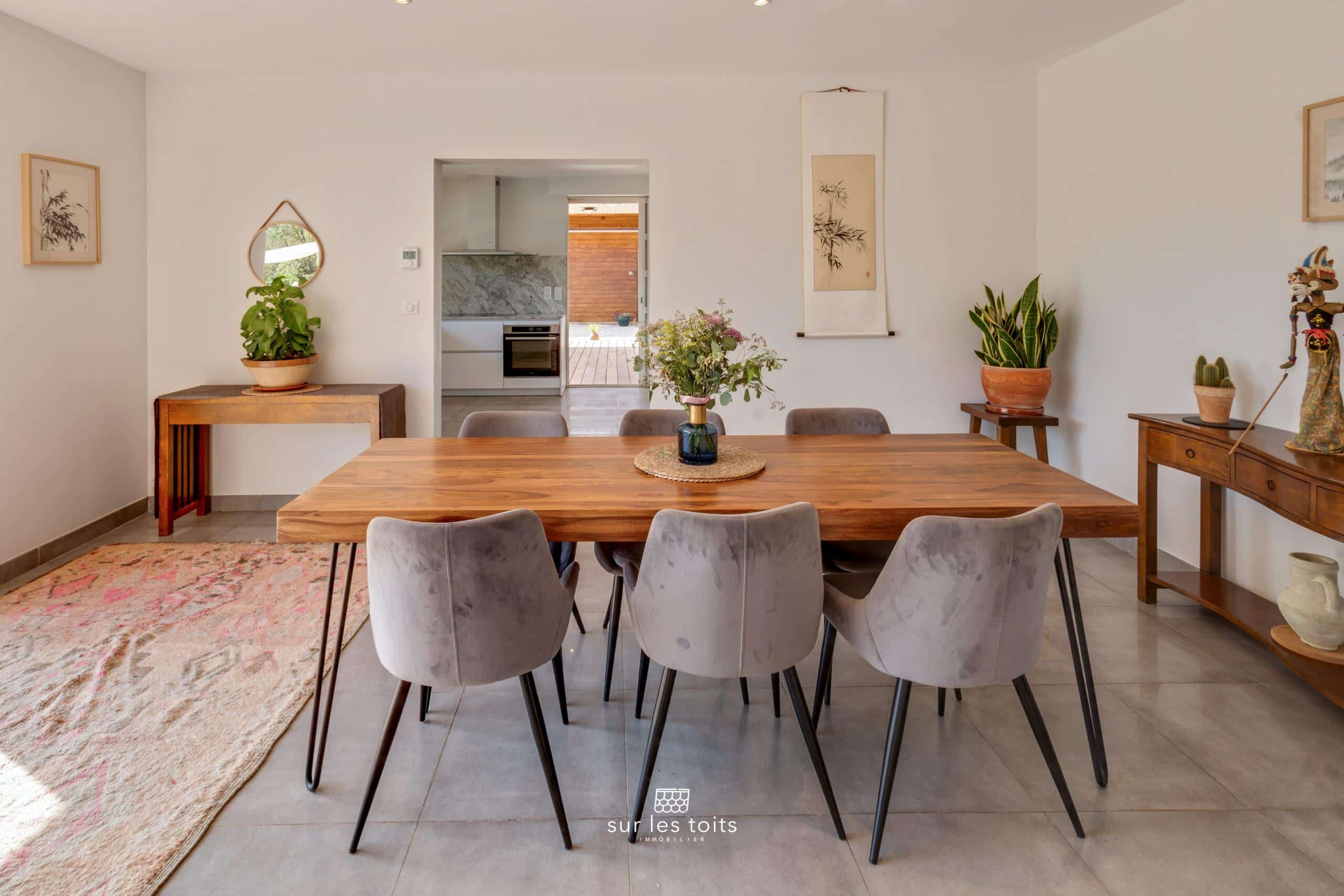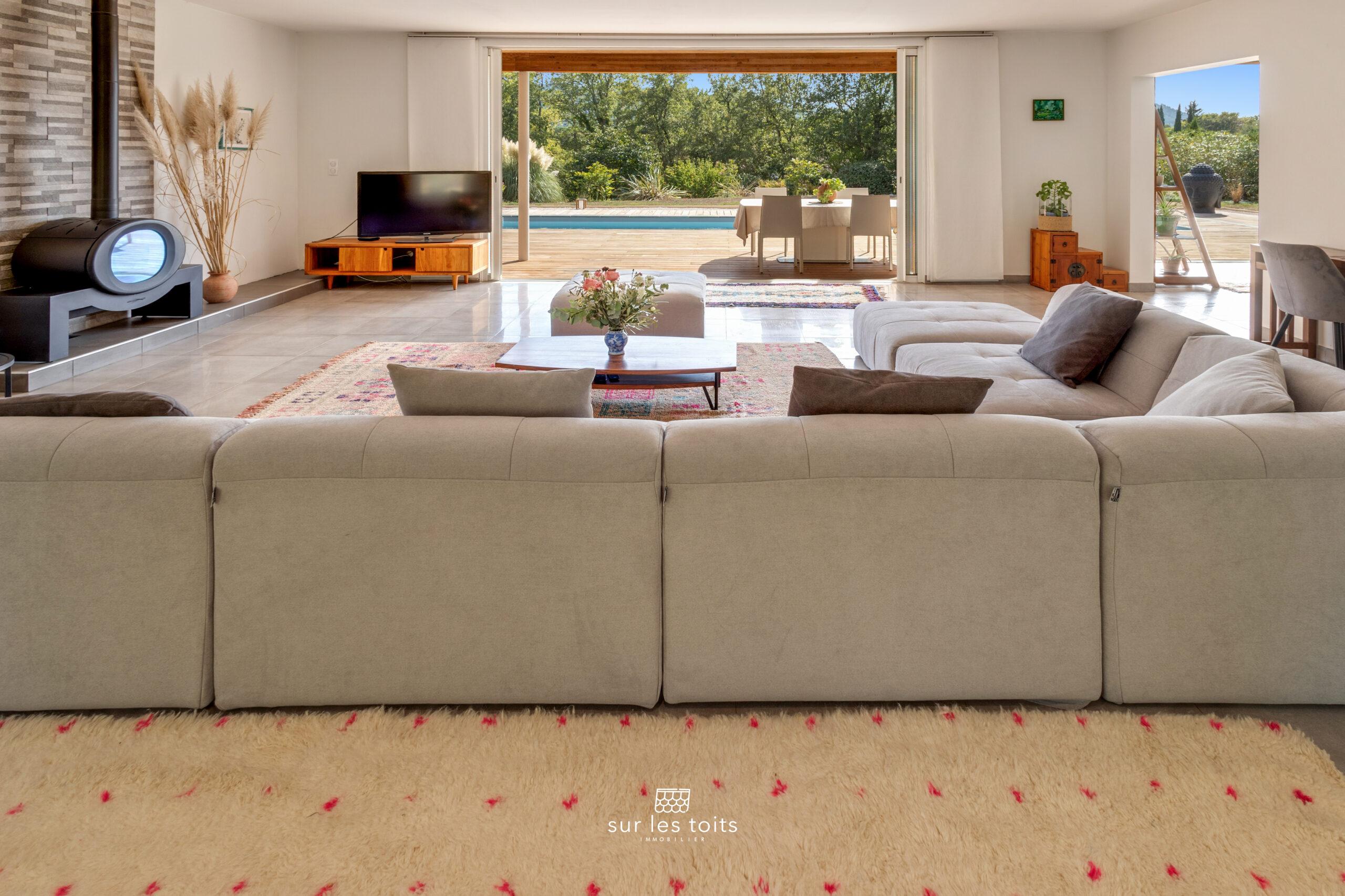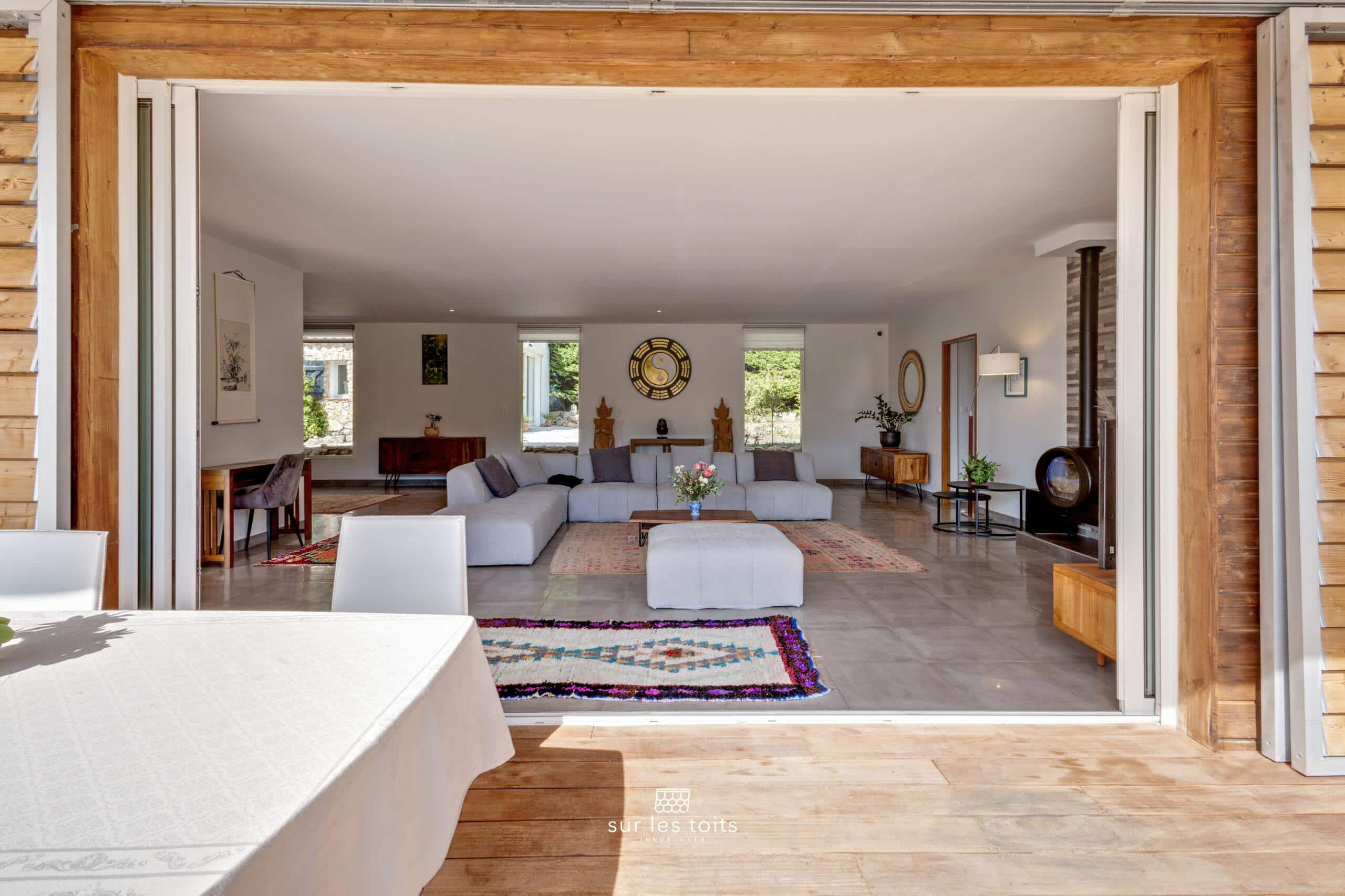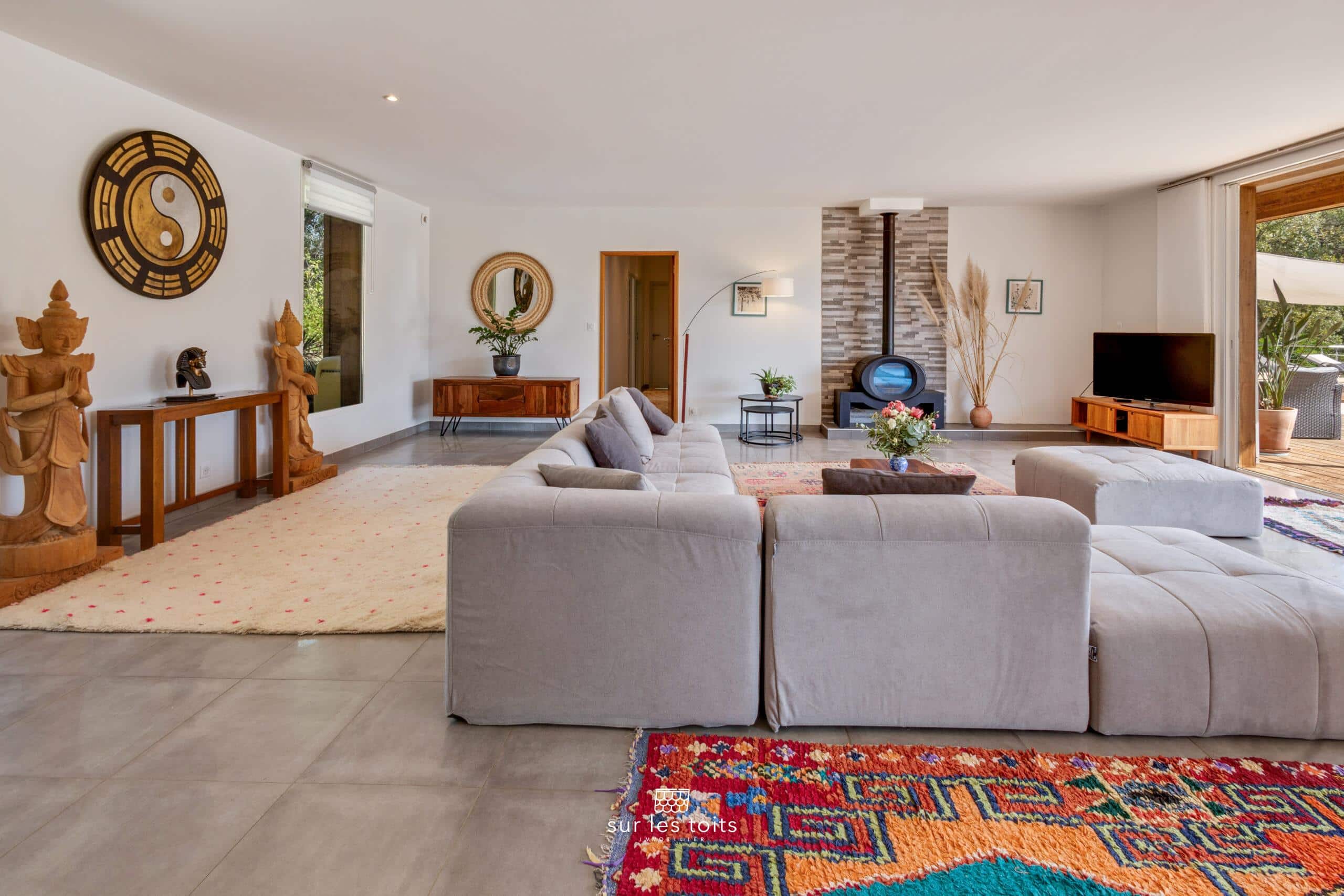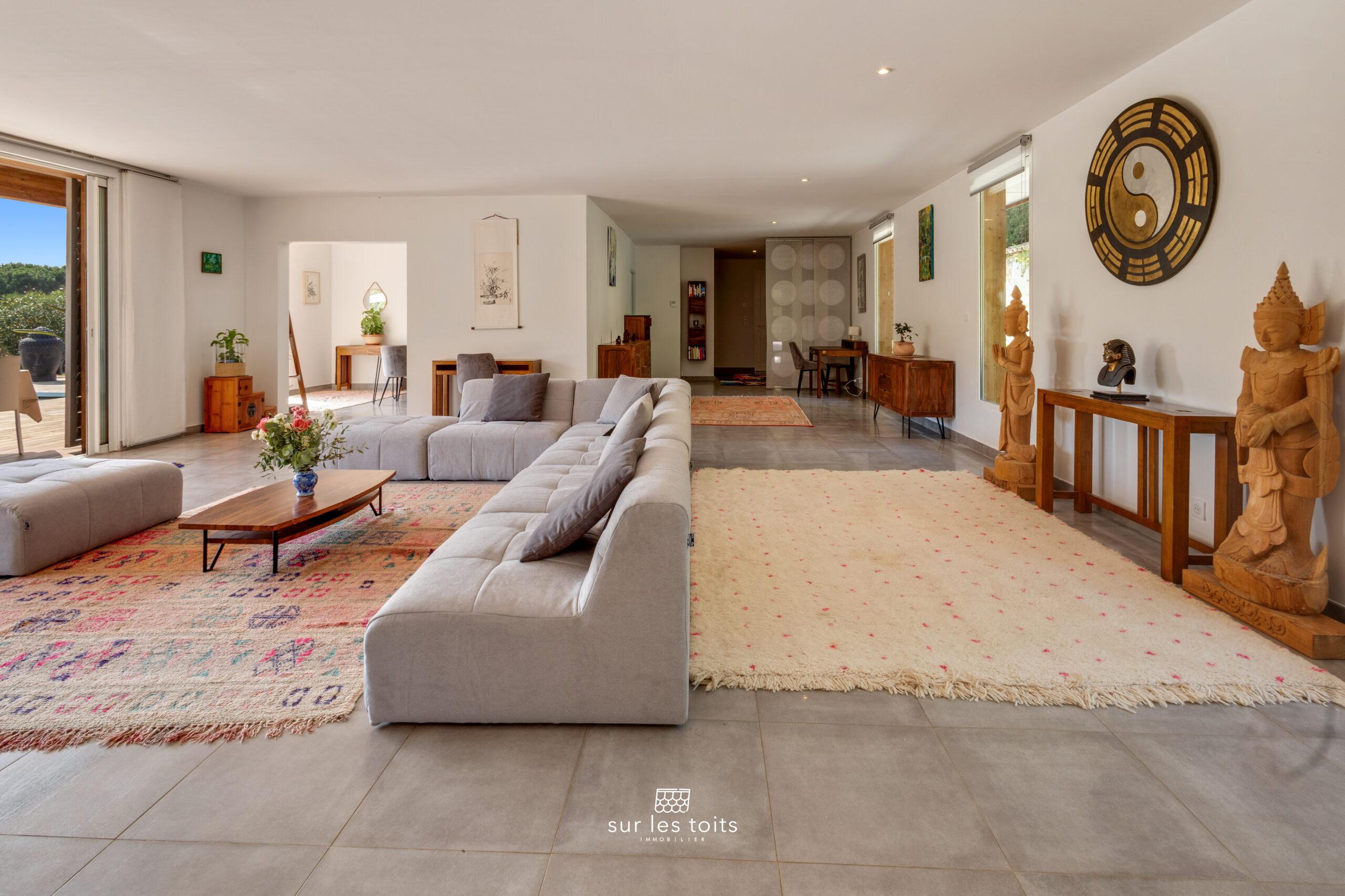 Passé son entrée magistrale et son portail automatisé, un espace fleuri avec de nombreuses places de parking accueille les visiteurs. Entièrement de plain-pied, le séjour est entièrement ouvert sur l’extérieur grâce à ses grandes baies à galandage et offre une lumière traversante omniprésente. L’espace de vie comprend un grand salon semi-ouvert sur la salle à manger, une cuisine moderne équipée et son arrière-cuisine, formant un espace de 110 m² baigné de lumière.
