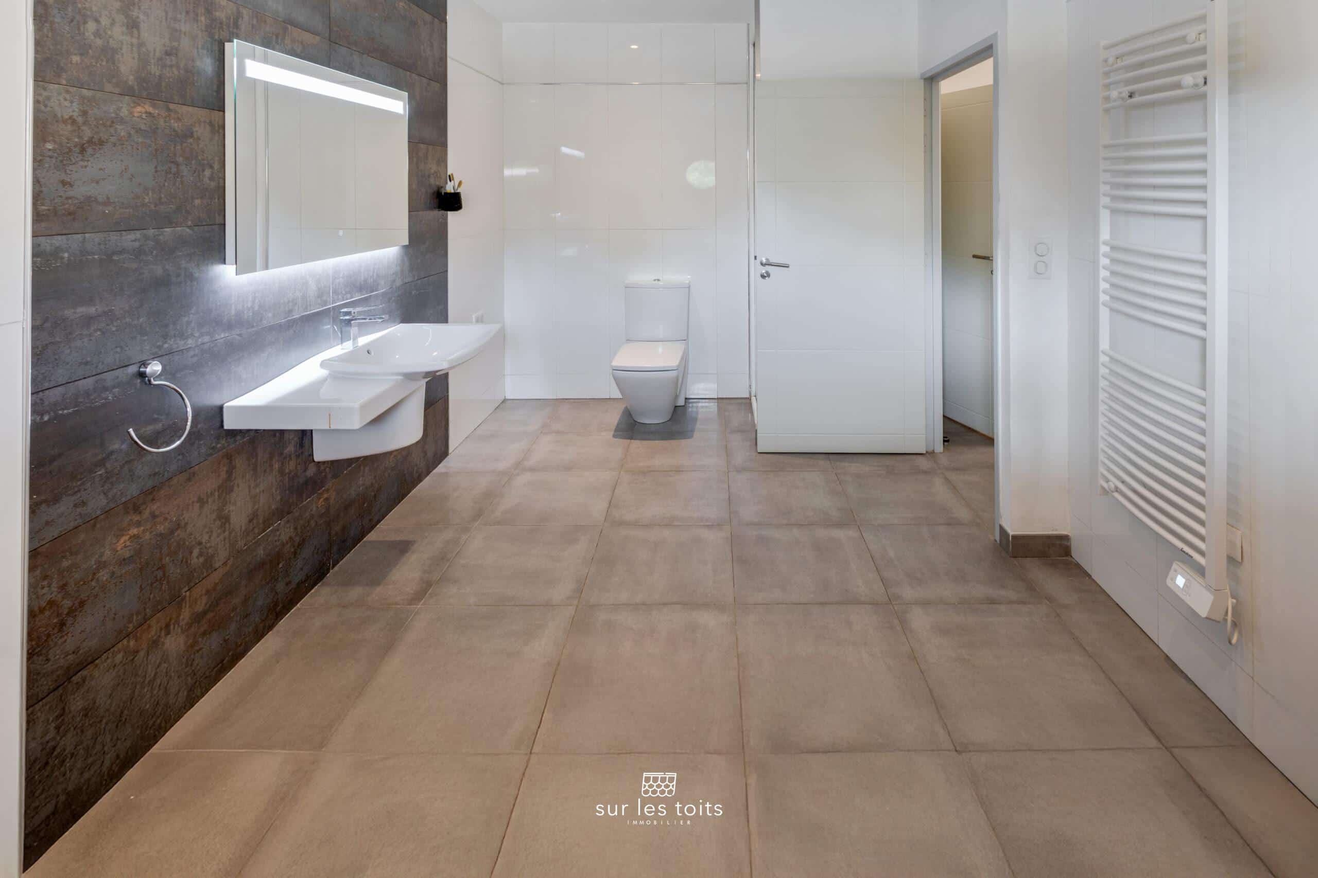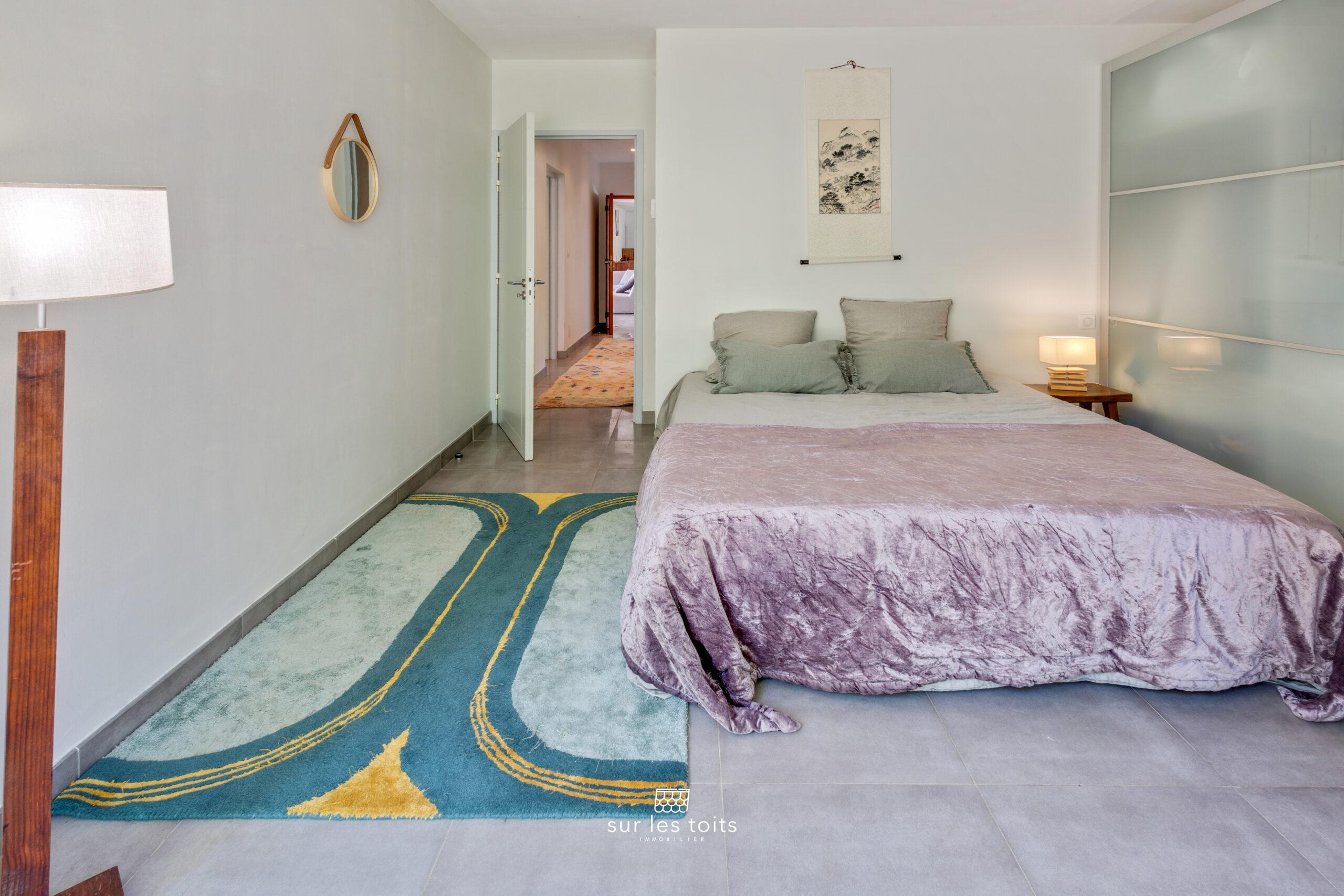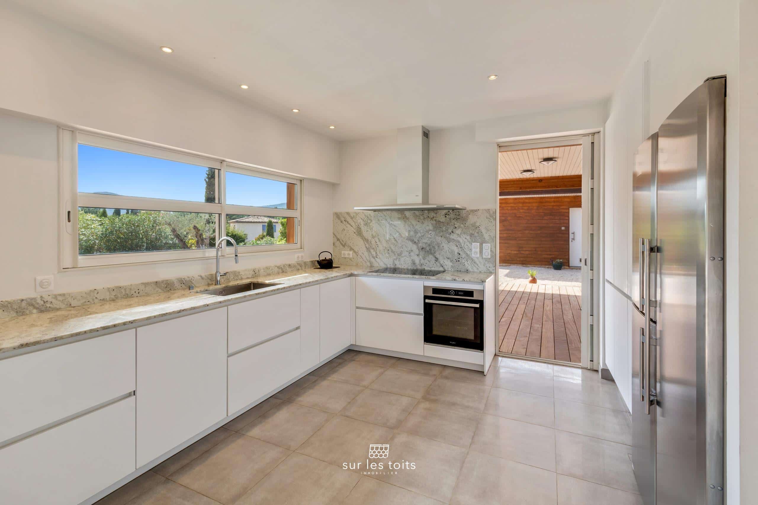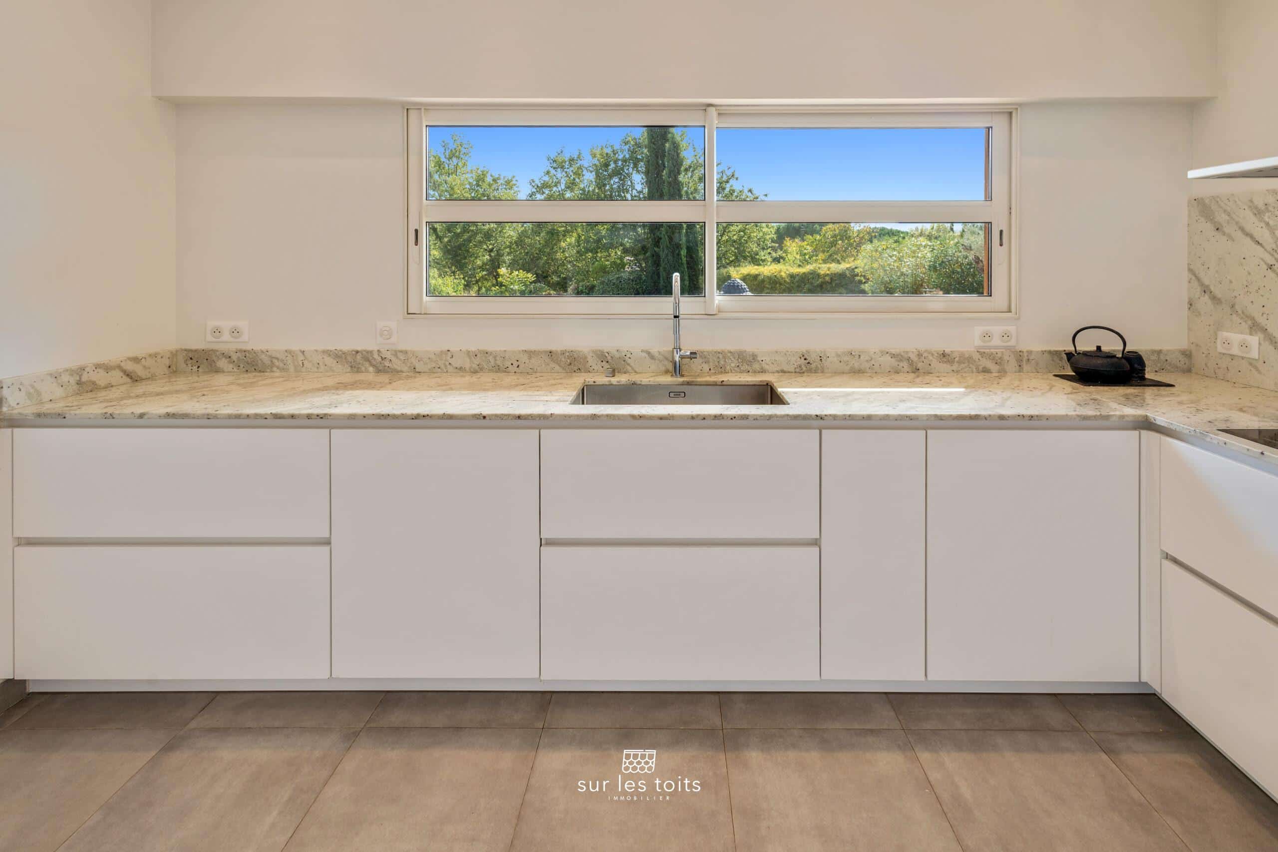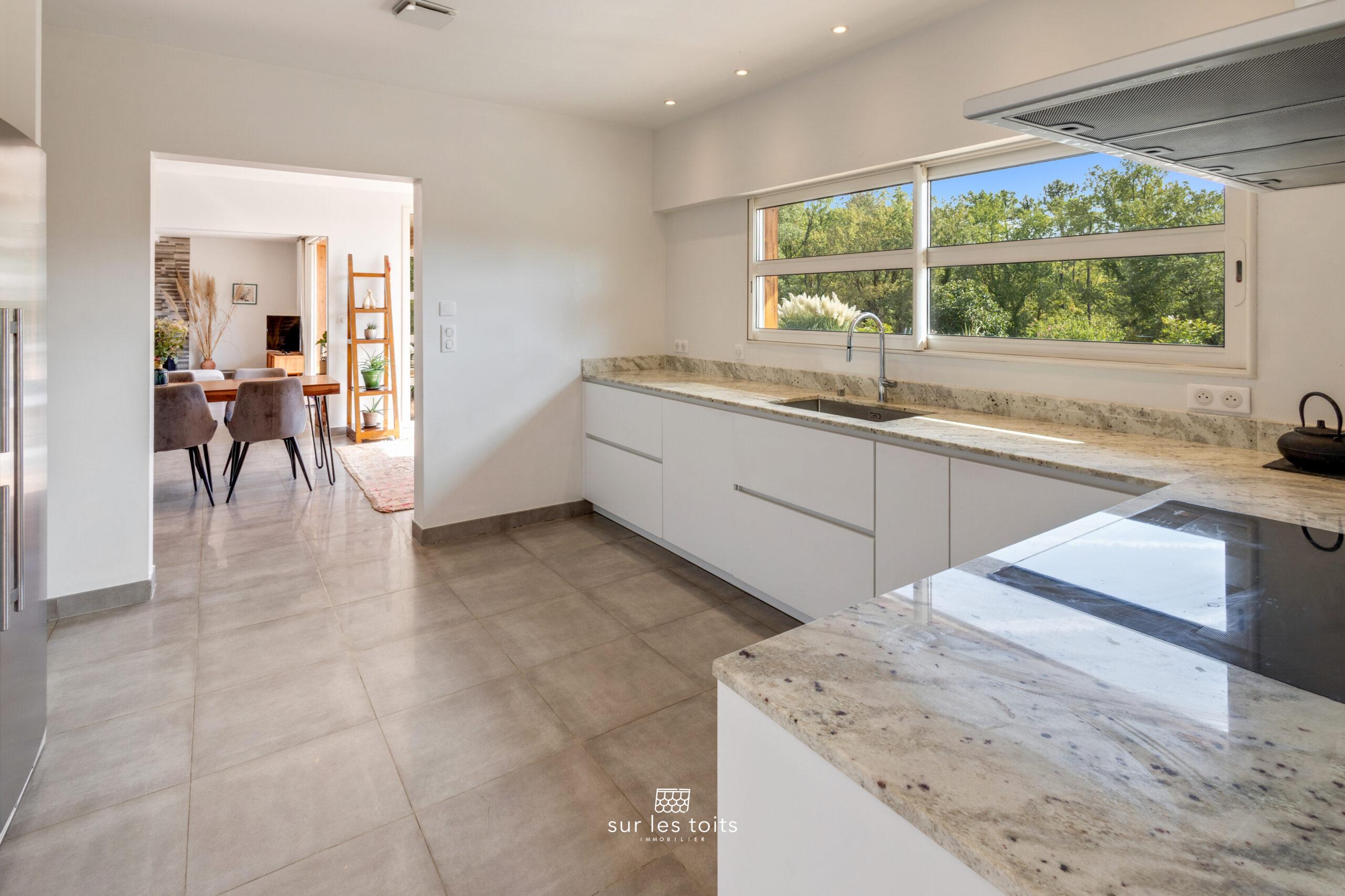 Passé son entrée magistrale et son portail automatisé, un espace fleuri avec de nombreuses places de parking accueille les visiteurs. Entièrement de plain-pied, le séjour est entièrement ouvert sur l’extérieur grâce à ses grandes baies à galandage et offre une lumière traversante omniprésente. L’espace de vie comprend un grand salon semi-ouvert sur la salle à manger, une cuisine moderne équipée et son arrière-cuisine, formant un espace de 110 m² baigné de lumière.