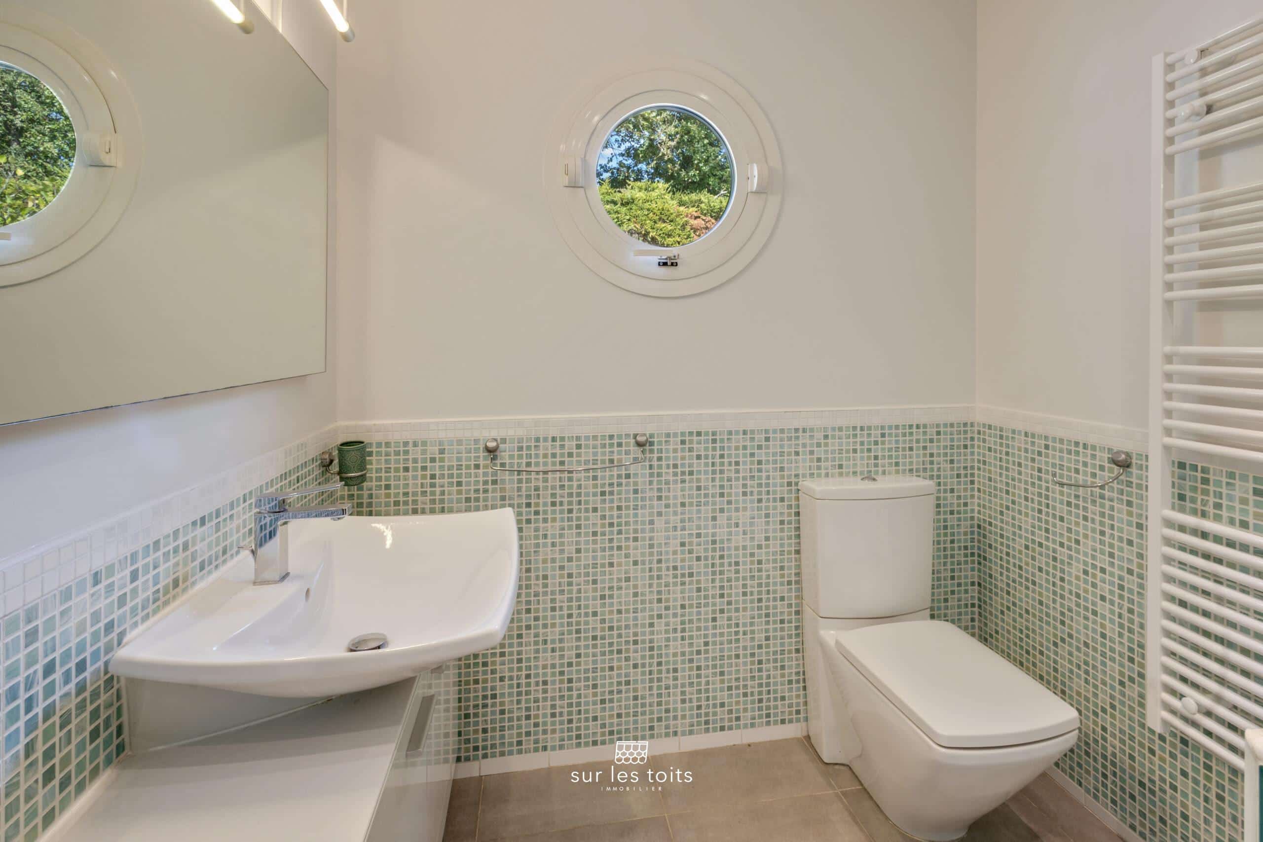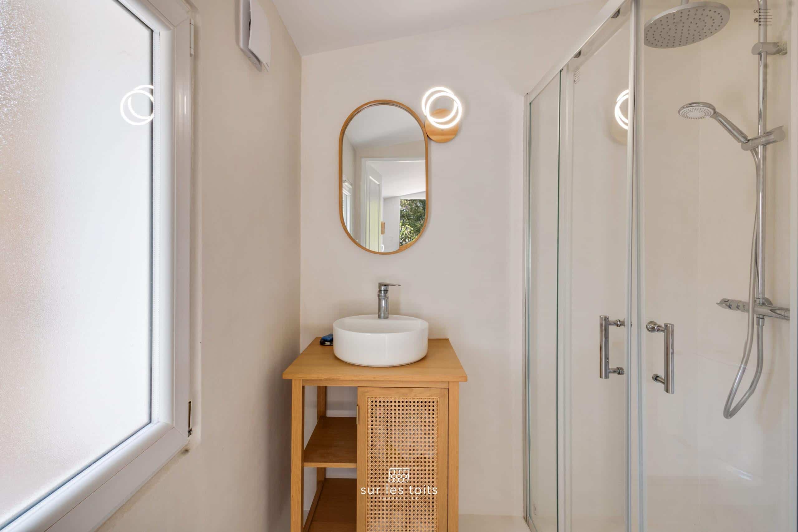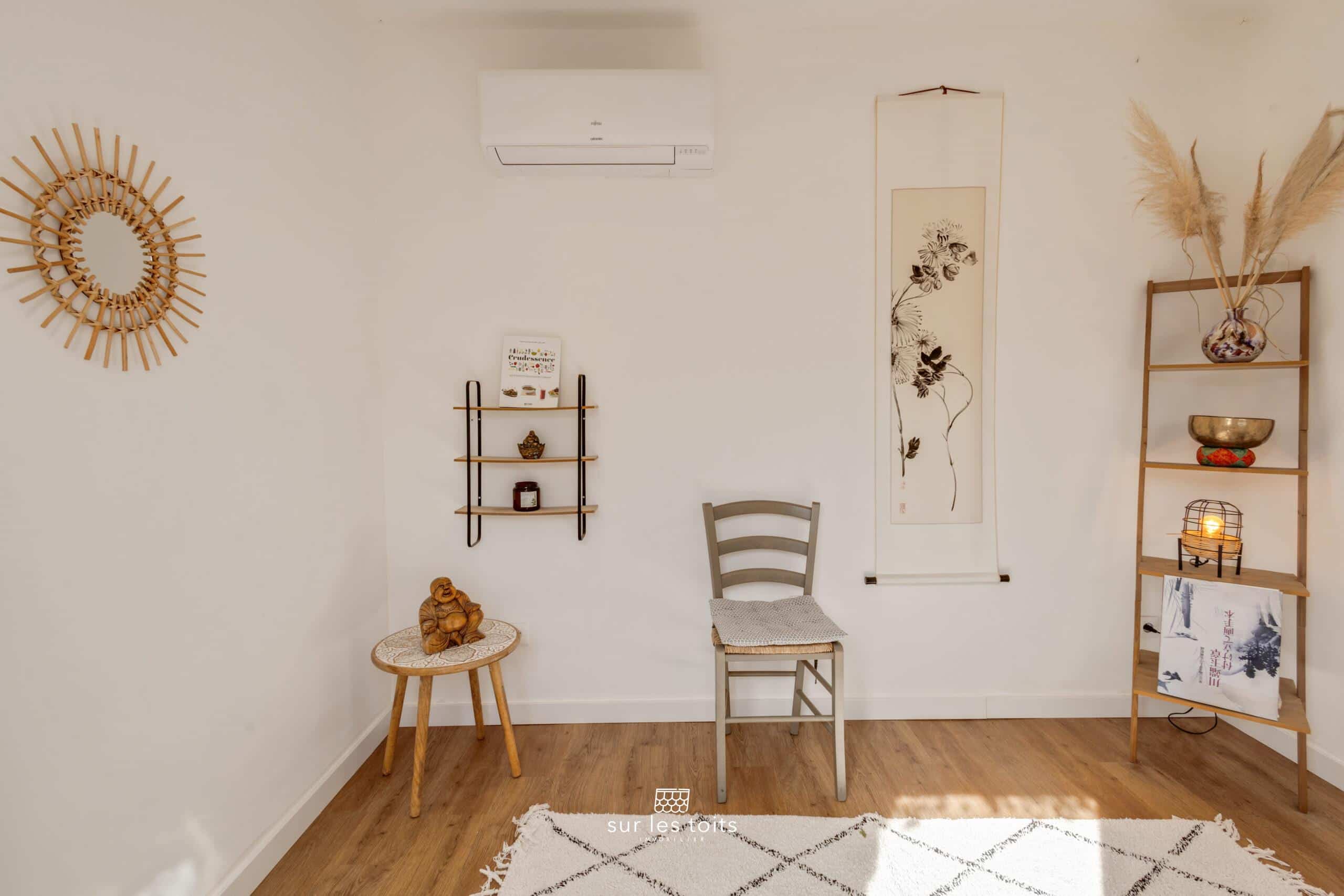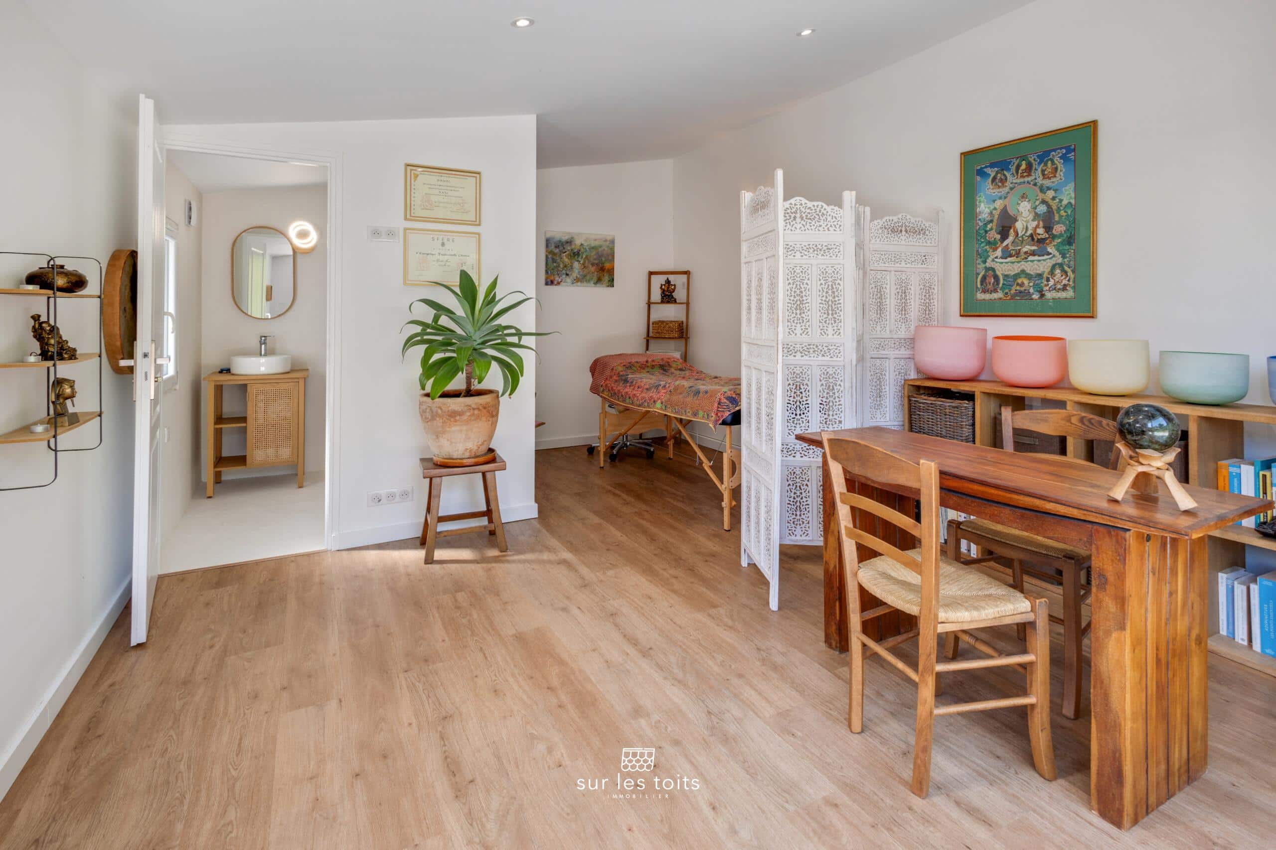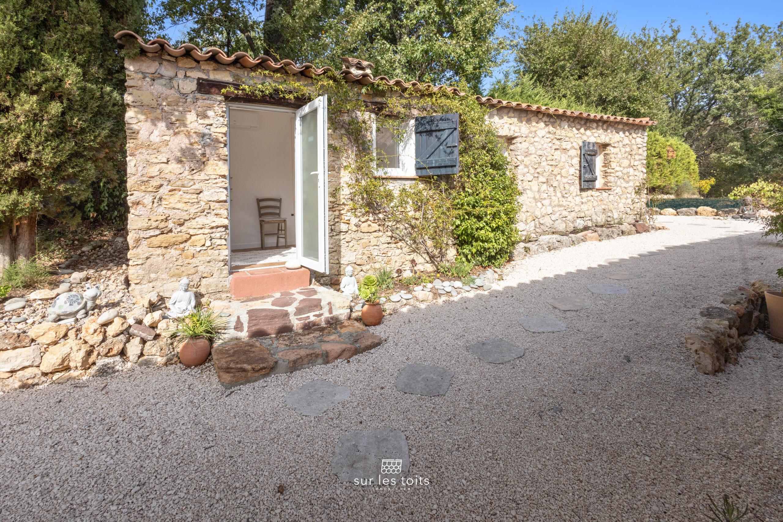 À l’arrière, un cabanon en pierres de 27 m² entièrement rénové avec salle de bain peut accueillir un cabinet professionnel ou redevenir un logement pour invités.