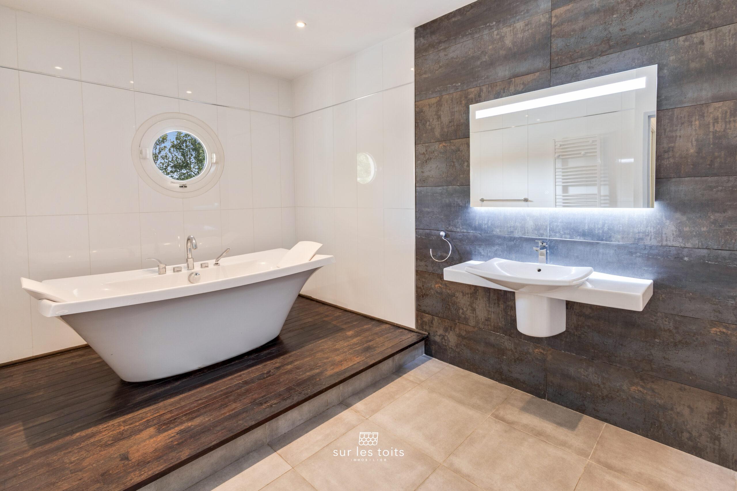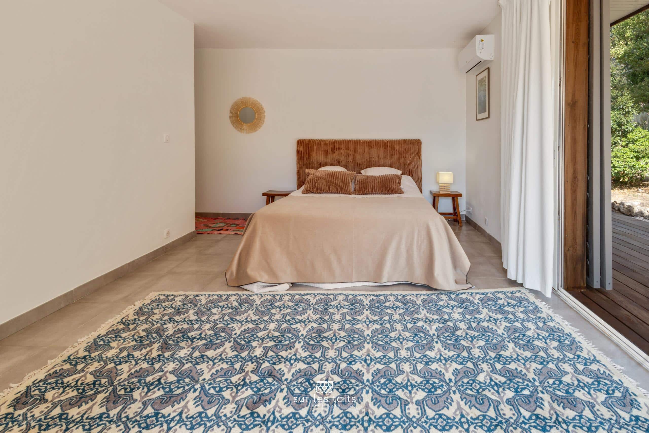 Elle dispose d’une suite parentale de 36 m² avec dressing et de deux chambres supplémentaires. Trois WC, une salle de bain et une salle d’eau complètent les espaces de nuit. La climatisation réversible est installée dans la suite parentale et dans le cabanon. La longère est entourée d’une terrasse en Cumaru de plus de 300 m², dont une partie abritée donnant directement sur la cuisine. Une piscine vient sublimer le jardin paysagé, bordée de galets blancs.